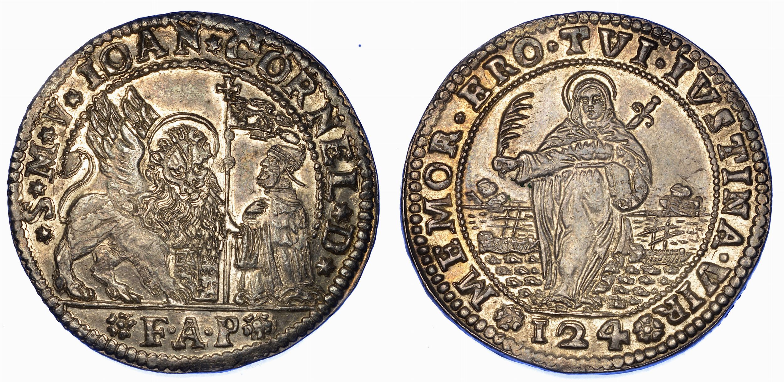 Leone di San Marco, alato e nimbato, verso d. e doge genuflesso con stendardo verso s.; in esergo, F A P (Francesco Antonio Paruta oppure Francesco Antonio Pasqualego) R/ Santa Giustina con cuore trafitto da pugnale regge ramo di palma e libro; sullo sfondo, galere in navigazione. CNI 13. Paolucci 21. g. 27,70. Diam. mm. 41,80. Arg. q.FDC