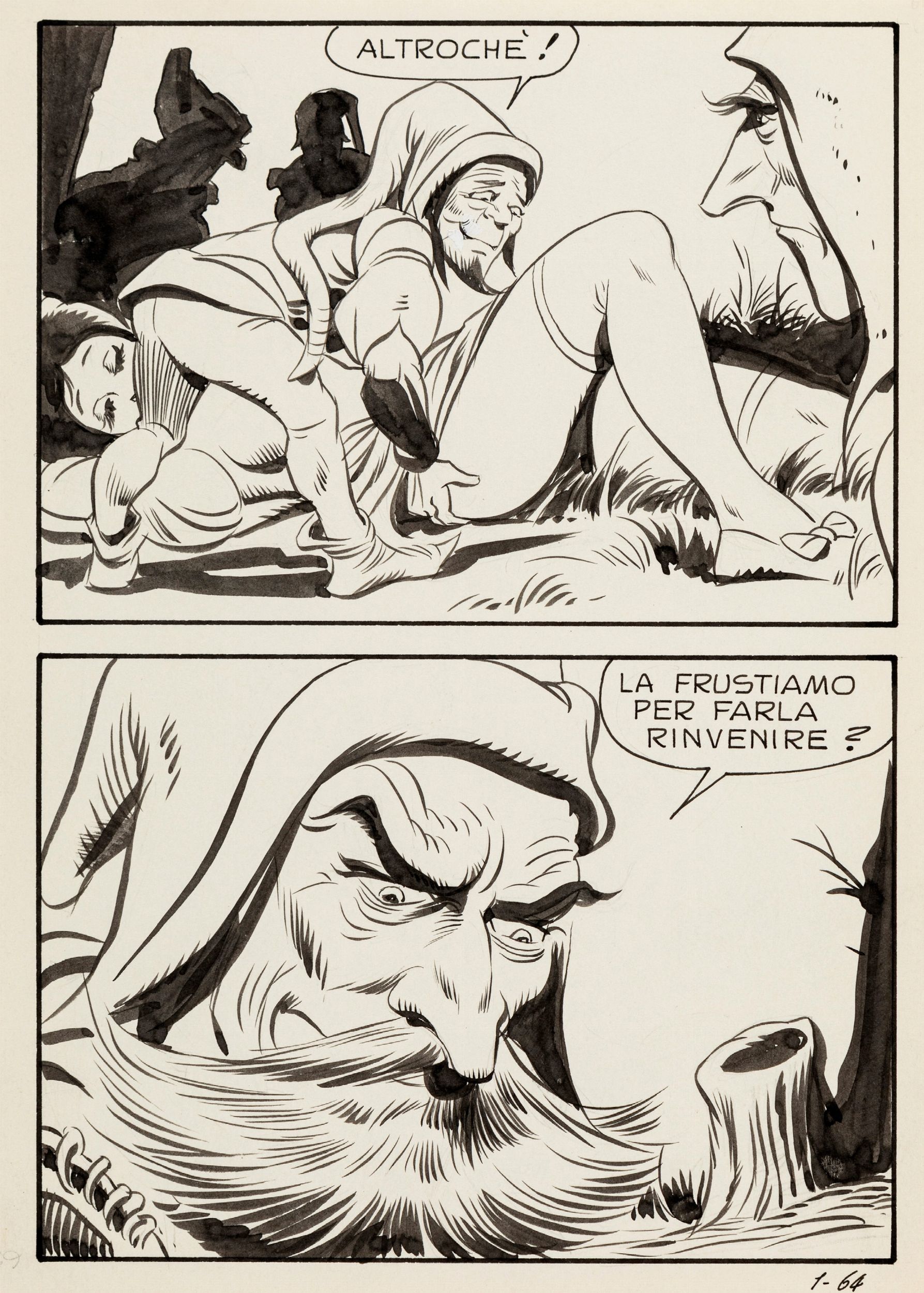 1972 Tavola originale realizzata da Frollo per I Sette Nani viziosi, lo storico primo numero della sua Biancaneve, edita a pag. 64 dalla Edifumetto nel 1972. Basata sull'omonima fiaba, racconta le vicende dell'ingenua protagonista che viene iniziata alle gioie del sesso dai sette nani; la serie racconta le avventure sessuali di Biancaneve in un mondo di principi, regine e mostri, riuscendo a restare vergine sotto continui assalti sessuali per i primi quattro episodi, per poi divenire la principessa del sesso libero e gioioso per tutti. A dieci anni esatti dalla nascita di Diabolik e del fumetto nero, si consuma nelle edicole italiane una nuova rivoluzione, da una intuizione di Renzo Barbieri nasce Biancaneve, suscitando grande scalpore e sconcerto sull'opinione pubblica. Biancaneve rivoluzionerà il modo di intendere e usufruire del fumetto, stravolgendo i luoghi comuni e gli stereotipi della società dell'epoca, inserendo nelle storie una provocante satira sociale e una, non velata, denuncia alla società bigotta, moralista e conservatrice, creando così un nuovo genere: le Sexy Favole per adulti.