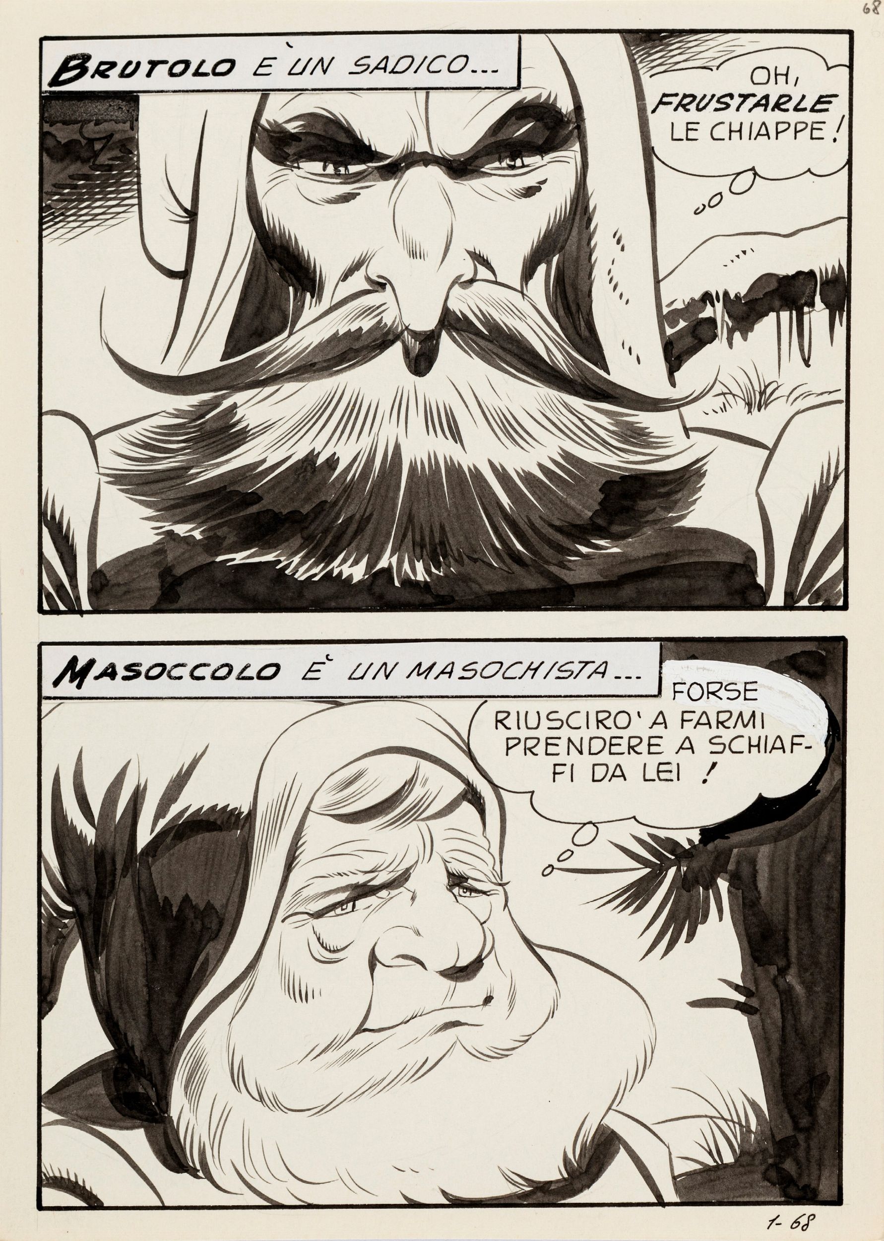 1972 Tavola originale realizzata da Frollo per I Sette Nani viziosi, lo storico primo numero della sua Biancaneve, edita a pag. 68 dalla Edifumetto nel 1972. Basata sull'omonima fiaba, racconta le vicende dell'ingenua protagonista che viene iniziata alle gioie del sesso dai sette nani; la serie racconta le avventure sessuali di Biancaneve in un mondo di principi, regine e mostri, riuscendo a restare vergine sotto continui assalti sessuali per i primi quattro episodi, per poi divenire la principessa del sesso libero e gioioso per tutti. A dieci anni esatti dalla nascita di Diabolik e del fumetto nero, si consuma nelle edicole italiane una nuova rivoluzione, da una intuizione di Renzo Barbieri nasce Biancaneve, suscitando grande scalpore e sconcerto sull'opinione pubblica. Biancaneve rivoluzionerà il modo di intendere e usufruire del fumetto, stravolgendo i luoghi comuni e gli stereotipi della società dell'epoca, inserendo nelle storie una provocante satira sociale e una, non velata, denuncia alla società bigotta, moralista e conservatrice, creando così un nuovo genere: le Sexy Favole per adulti.