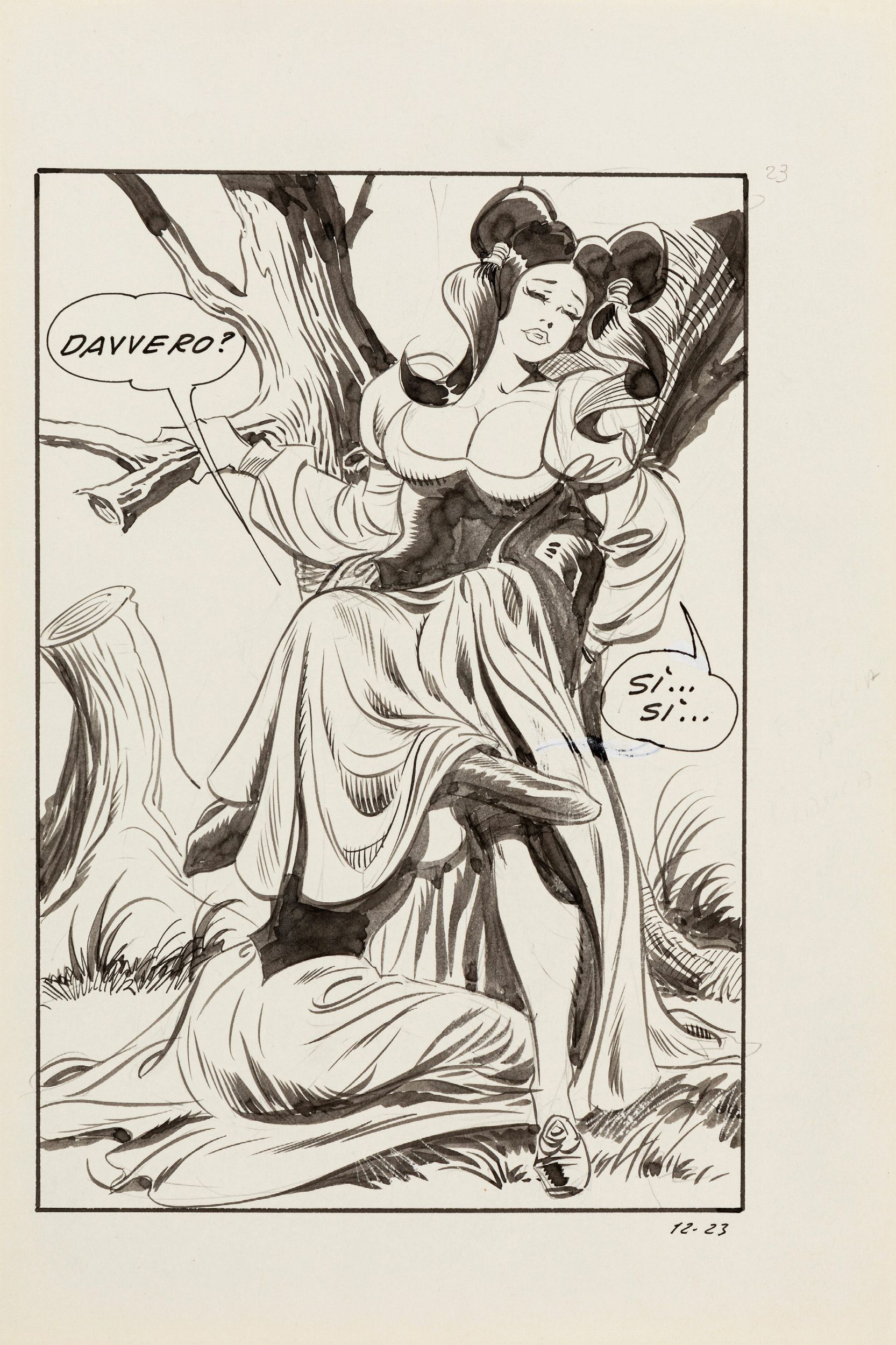 1973 Tavola originale realizzata da Frollo per La punizione di Naga, edita su Biancaneve n. 12 a pag. 23 dalla Edifumetto nel 1973. Basata sull'omonima fiaba, racconta le vicende dell'ingenua protagonista che viene iniziata alle gioie del sesso dai sette nani; la serie racconta le avventure sessuali di Biancaneve in un mondo di principi, regine e mostri, riuscendo a restare vergine sotto continui assalti sessuali per i primi quattro episodi, per poi divenire la principessa del sesso libero e gioioso per tutti. A dieci anni esatti dalla nascita di Diabolik e del fumetto nero, si consuma nelle edicole italiane una nuova rivoluzione, da una intuizione di Renzo Barbieri nasce Biancaneve, suscitando grande scalpore e sconcerto sull'opinione pubblica. Biancaneve rivoluzionerà il modo di intendere e usufruire del fumetto, stravolgendo i luoghi comuni e gli stereotipi della società dell'epoca, inserendo nelle storie una provocante satira sociale e una, non velata, denuncia alla società bigotta, moralista e conservatrice, creando così un nuovo genere: le Sexy Favole per adulti.