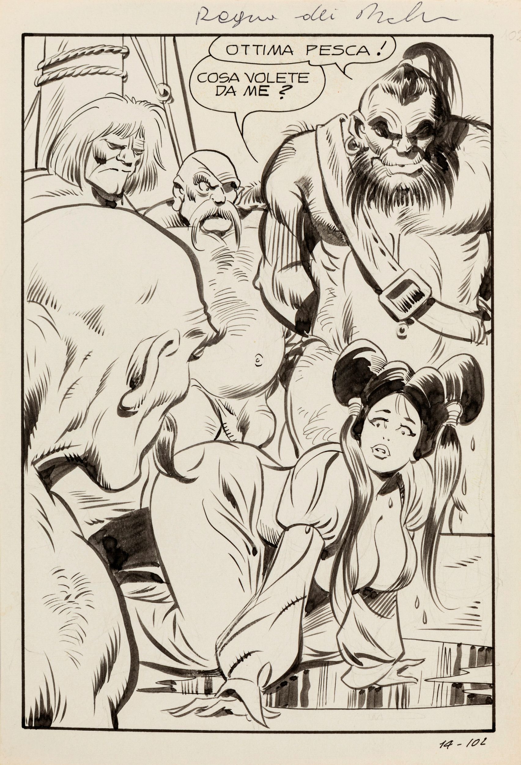 1973 Tavola originale realizzata da Frollo per Senza Bernarda, edita su Biancaneve n. 14 a pag. 102 dalla Edifumetto nel 1973. Basata sull'omonima fiaba, racconta le vicende dell'ingenua protagonista che viene iniziata alle gioie del sesso dai sette nani; la serie racconta le avventure sessuali di Biancaneve in un mondo di principi, regine e mostri, riuscendo a restare vergine sotto continui assalti sessuali per i primi quattro episodi, per poi divenire la principessa del sesso libero e gioioso per tutti. A dieci anni esatti dalla nascita di Diabolik e del fumetto nero, si consuma nelle edicole italiane una nuova rivoluzione, da una intuizione di Renzo Barbieri nasce Biancaneve, suscitando grande scalpore e sconcerto sull'opinione pubblica. Biancaneve rivoluzionerà il modo di intendere e usufruire del fumetto, stravolgendo i luoghi comuni e gli stereotipi della società dell'epoca, inserendo nelle storie una provocante satira sociale e una, non velata, denuncia alla società bigotta, moralista e conservatrice, creando così un nuovo genere: le Sexy Favole per adulti.