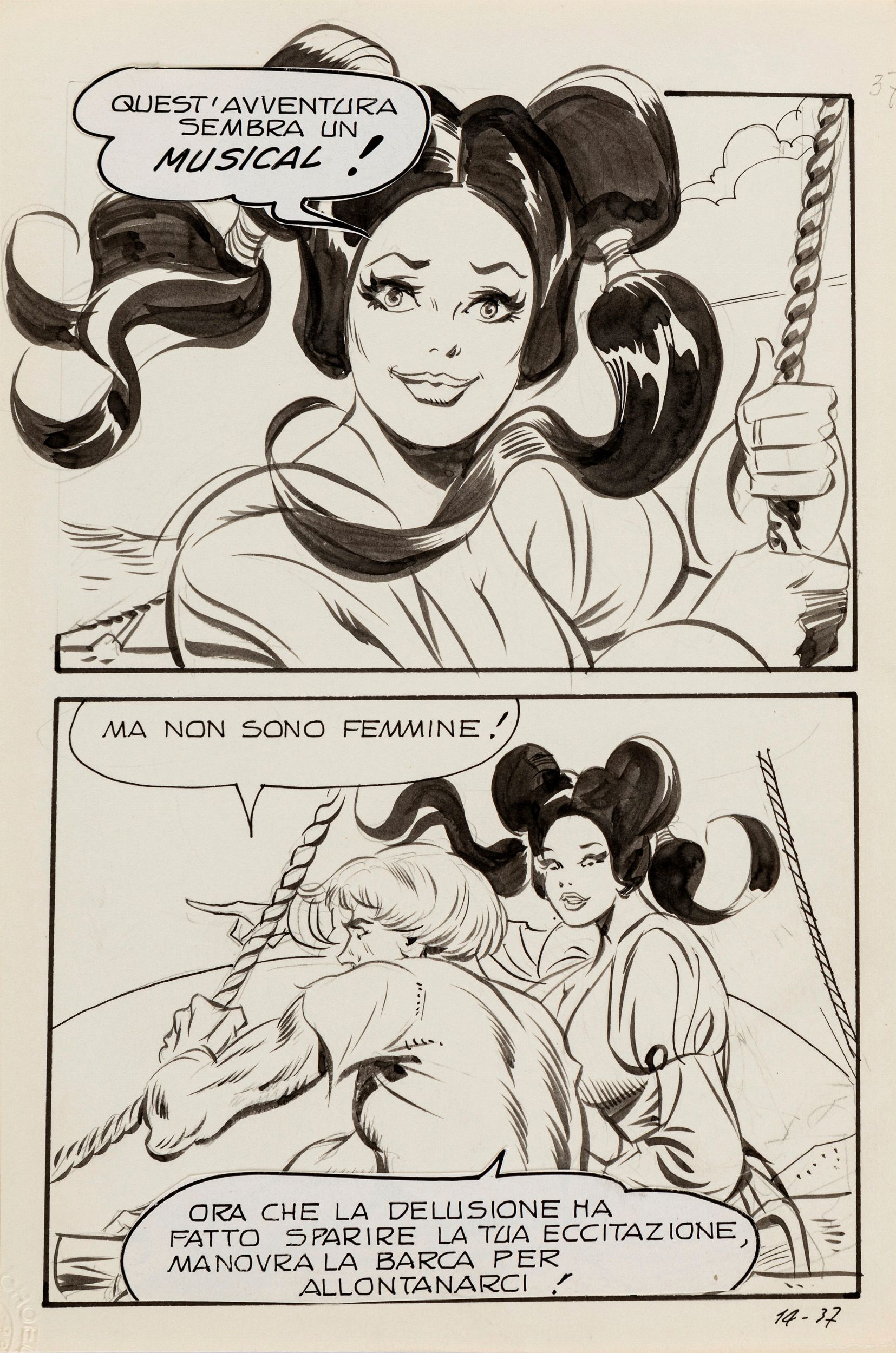 1973 Tavola originale realizzata da Frollo per Senza Bernarda, edita su Biancaneve n. 14 a pag. 37 dalla Edifumetto nel 1973. Basata sull'omonima fiaba, racconta le vicende dell'ingenua protagonista che viene iniziata alle gioie del sesso dai sette nani; la serie racconta le avventure sessuali di Biancaneve in un mondo di principi, regine e mostri, riuscendo a restare vergine sotto continui assalti sessuali per i primi quattro episodi, per poi divenire la principessa del sesso libero e gioioso per tutti. A dieci anni esatti dalla nascita di Diabolik e del fumetto nero, si consuma nelle edicole italiane una nuova rivoluzione, da una intuizione di Renzo Barbieri nasce Biancaneve, suscitando grande scalpore e sconcerto sull'opinione pubblica. Biancaneve rivoluzionerà il modo di intendere e usufruire del fumetto, stravolgendo i luoghi comuni e gli stereotipi della società dell'epoca, inserendo nelle storie una provocante satira sociale e una, non velata, denuncia alla società bigotta, moralista e conservatrice, creando così un nuovo genere: le Sexy Favole per adulti.