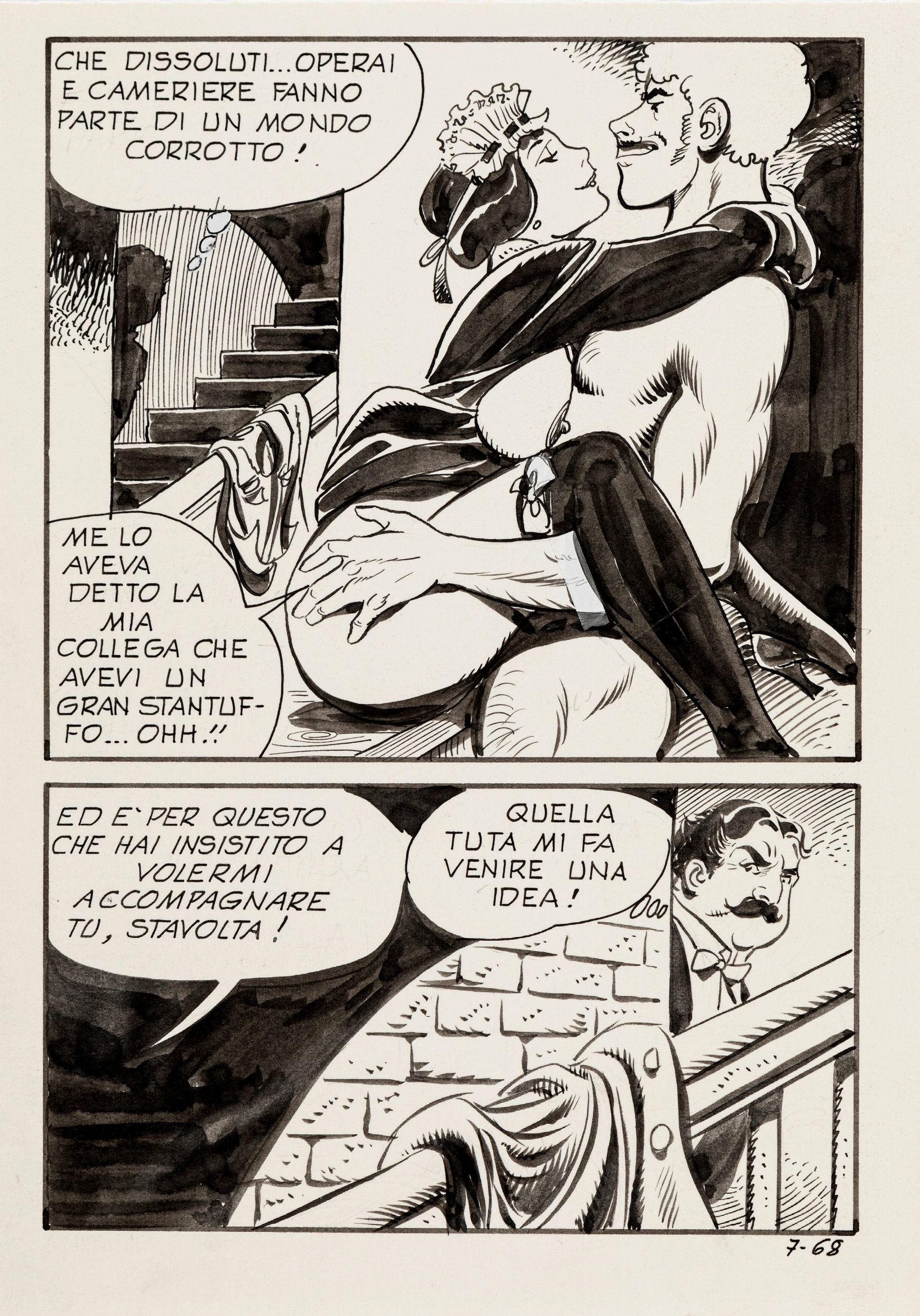 matita e china su cartoncino, 15 x 21 cm 1985 Tavola originale realizzata da Frollo per Inferno e piacere, edita su Casino n. 7 a pag. 68 dalla Edifumetto nel 1985. Siamo nella Parigi del 1898. Madame Con gestisce la Maison Bianche, una rinomata casa di tolleranza dove splendide e disinibite ragazze sono pronte a compiacere esigenti clienti dai gusti particolari. Storie che spaziano nelle predilezioni erotiche più bizzarre, dove l'abilità grafica e il gusto di Leone Frollo hanno modo di esprimersi al meglio inscenando un erotismo elegante, con suggestioni tra liberty e belle époque.