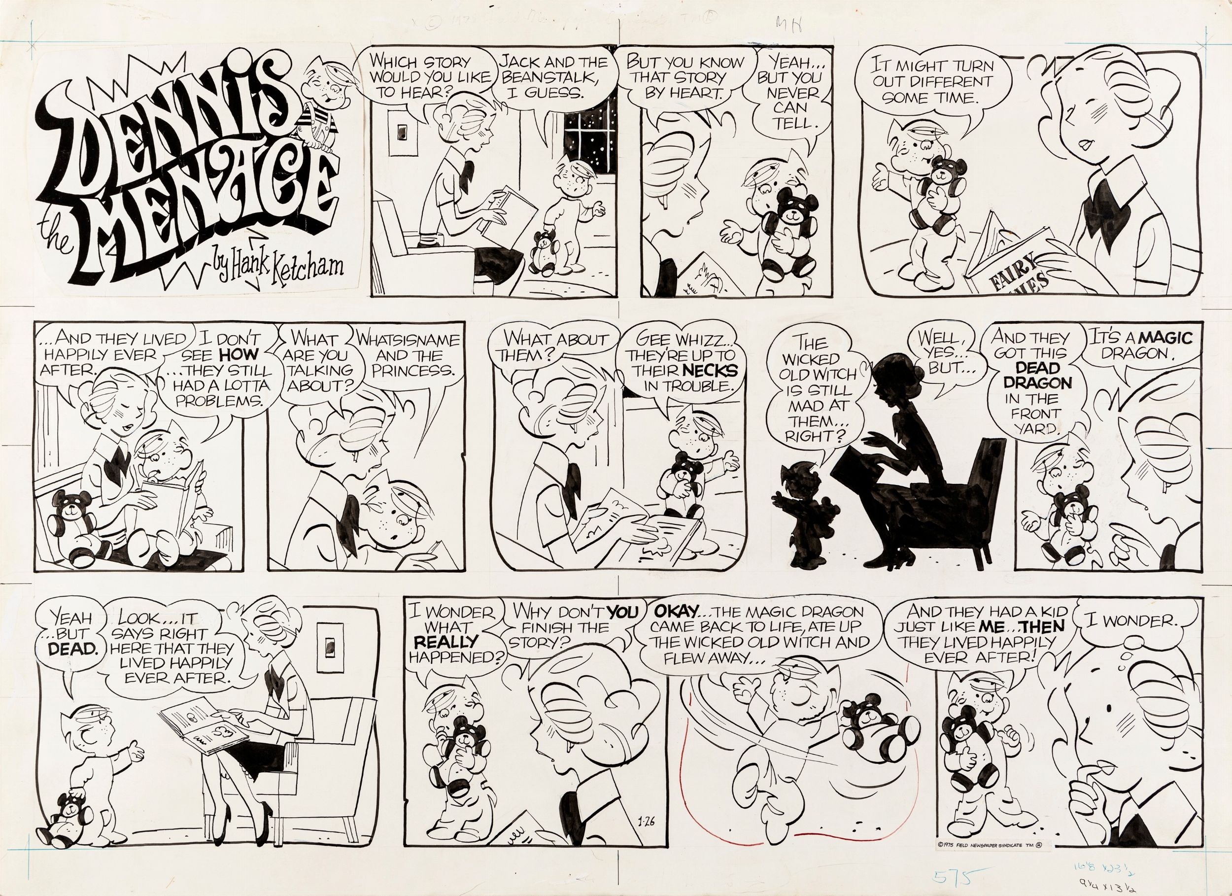 1975 Tavola domenicale del 26/01/1975 per Dennis the Menace. Si allega la prova colore a tempera su carta (34,5 x 25,5 cm). Fori di affissione al margine superiore.