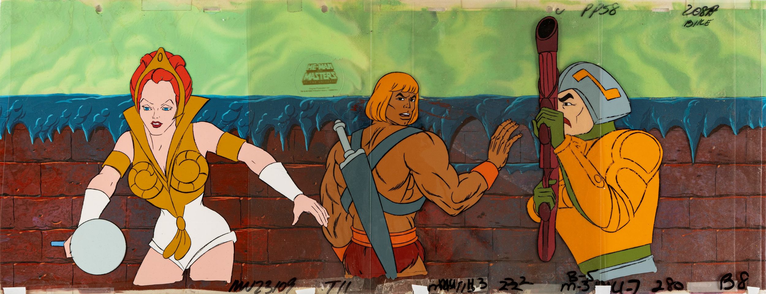 tempera su rodovetro e su cartoncino, 69 x 27 cm 1983 Cel originale (8 fogli) su fondale dipinto realizzata dalla Filmation per la serie animata He-Man and the Masters of the Universe, andata in onda per la prima volta nel 1983. Si allegano due douga corrispondenti.