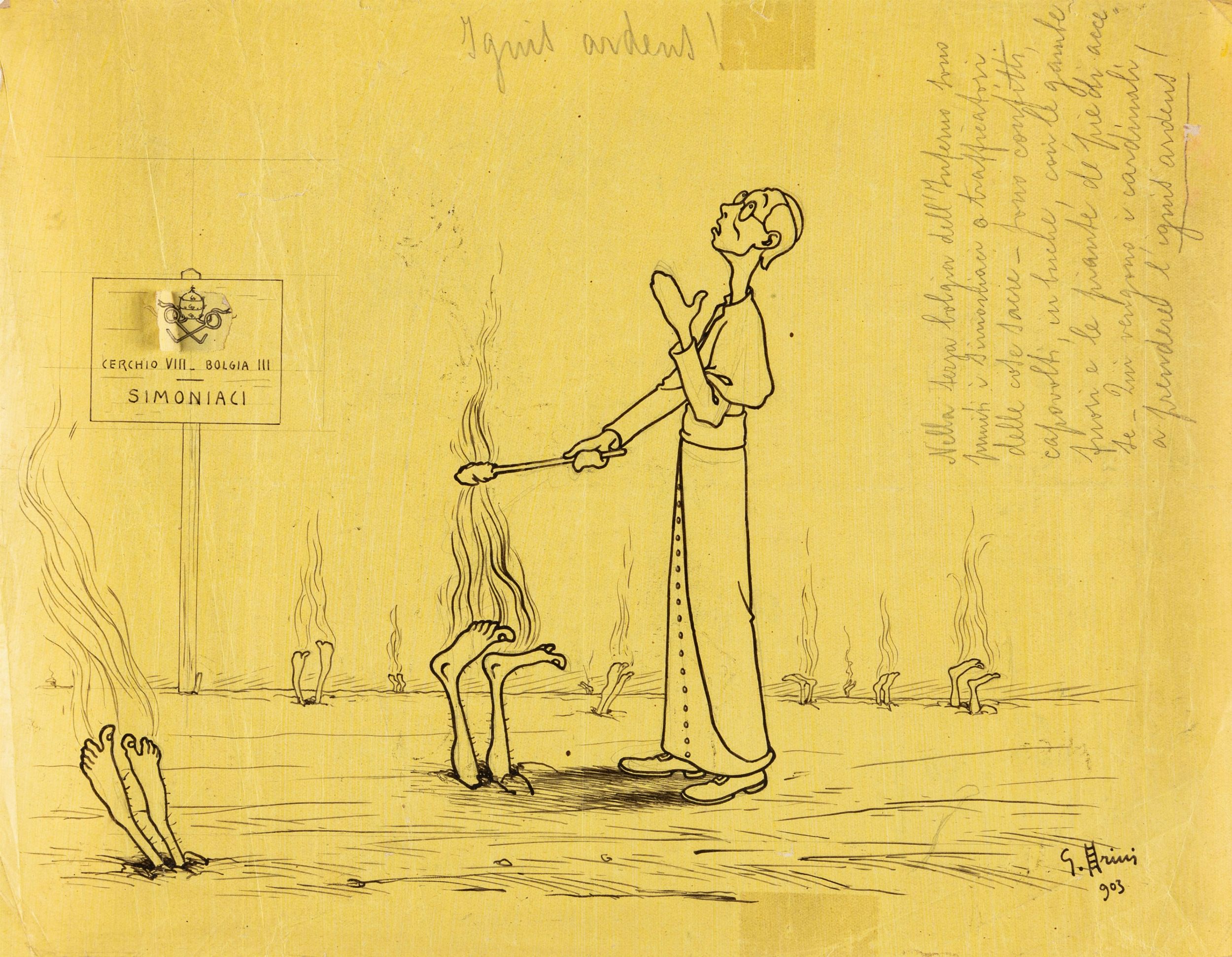 matita e china su carta gialla, 32,5 x 25 cm 1903 Illustrazione originale realizzata da Scalarini nel 1903 per il settimanale illustrato Merlin Cocai. << Nella terza bolgia dell'inferno sono puniti i simoniaci e trafficatori delle cose sacre. Sono confitti, capovolti, in buche, con le gambe fuori e le piante dè piedi accese. Qui vengono a prendere l'ignis ardens. >> È ìl più politico dei caricaturisti italiani e forse del mondo. La sintesi è la base del suo pensiero e del suo disegno crudele. (...) La sua caricatura è veleno, è morte. Guardando queste grandi opere io mi spavento. Scalarini è un caricaturista che passerà alla storia (Emilio Zanzi). Provenienza: collezione Caramba (Luigi Sapelli). Diverse pieghe. Firmata e datata.
