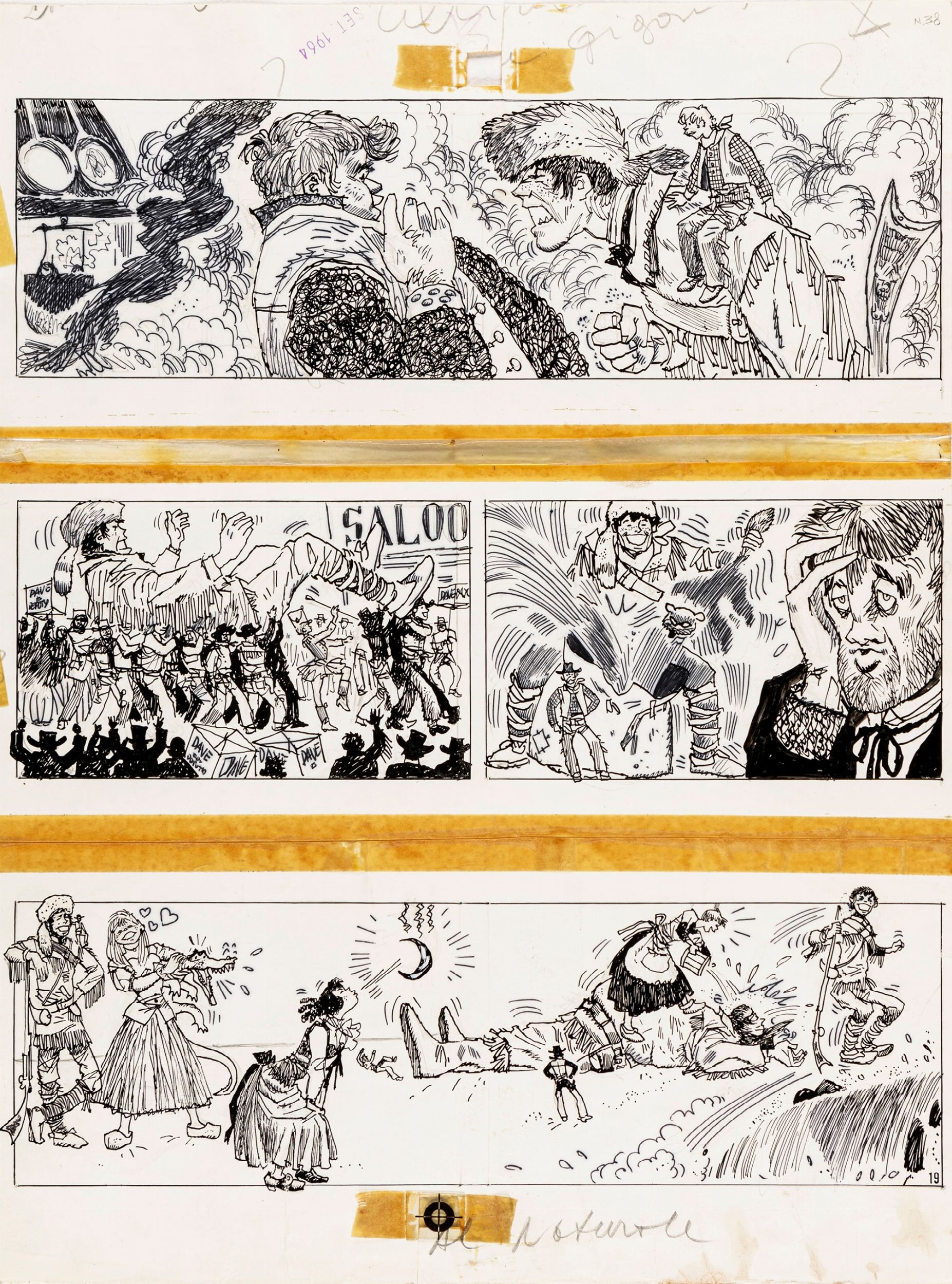 matita e china su cartoncino, 26 x 35,5 cm 1964 Tavola originale realizzata da Pratt per Il favoloso West: I giganti burloni, pag. 19 di questa ballata folk pubblicata per la prima volta sul C.d.P n. 32 nel 1964. Su tre pannelli. Colorata al retro a tempera. Lievi pieghe al margine inferiore.
