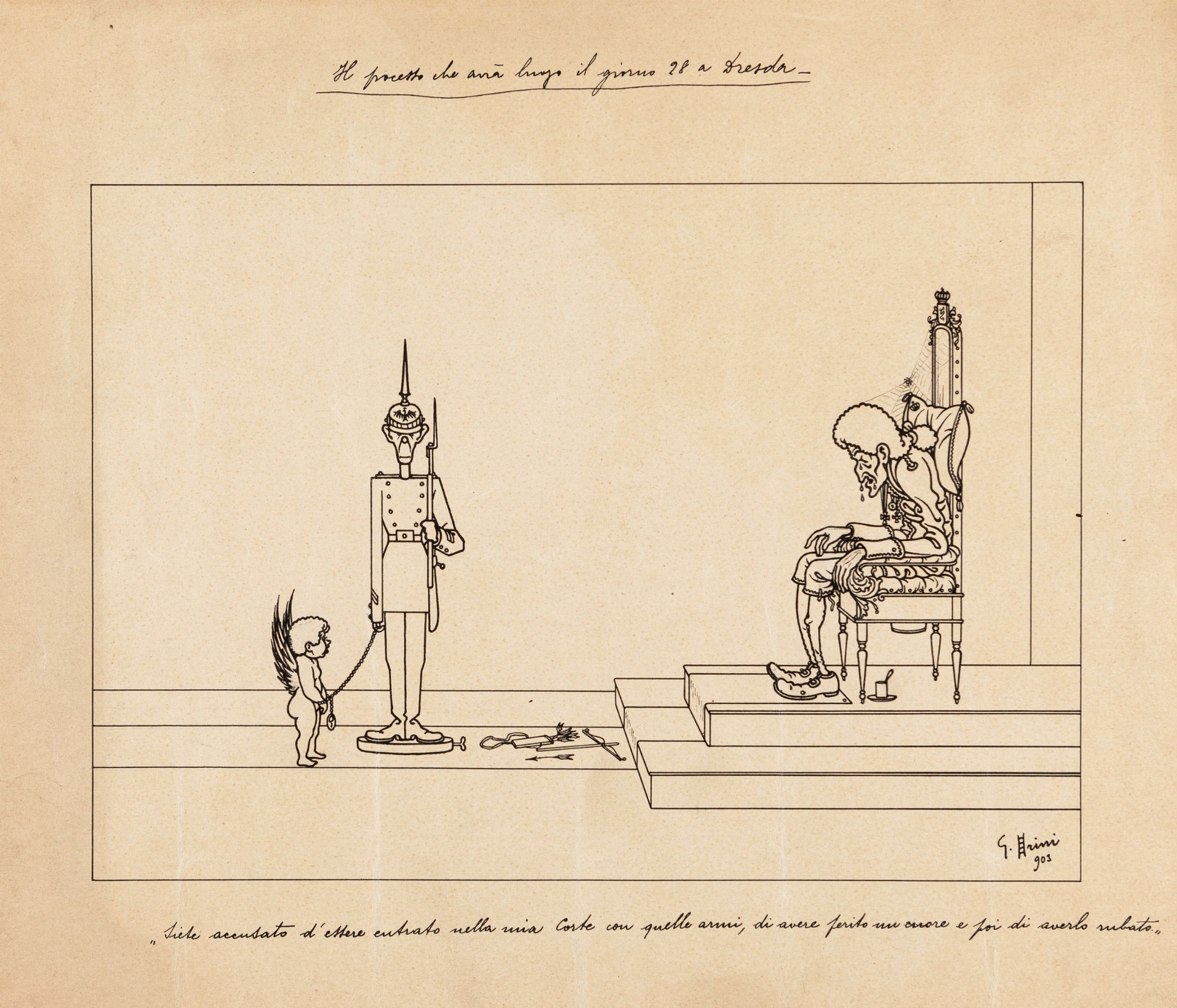 matita e china su cartoncino, 34 x 29 cm 1903 Illustrazione originale realizzata da Scalarini nel 1903 per il settimanale illustrato Merlin Cocai. << Siete accusato d'essere entrato nella mia Corte con quelle armi, di avere ferito un cuore e poi di averlo rubato. >> È ìl più politico dei caricaturisti italiani e forse del mondo. La sintesi è la base del suo pensiero e del suo disegno crudele. (...) La sua caricatura è veleno, è morte. Guardando queste grandi opere io mi spavento. Scalarini è un caricaturista che passerà alla storia (Emilio Zanzi). Provenienza: collezione Caramba (Luigi Sapelli). Lievi pieghe verticali al margine inferiore. Firmata e datata.
