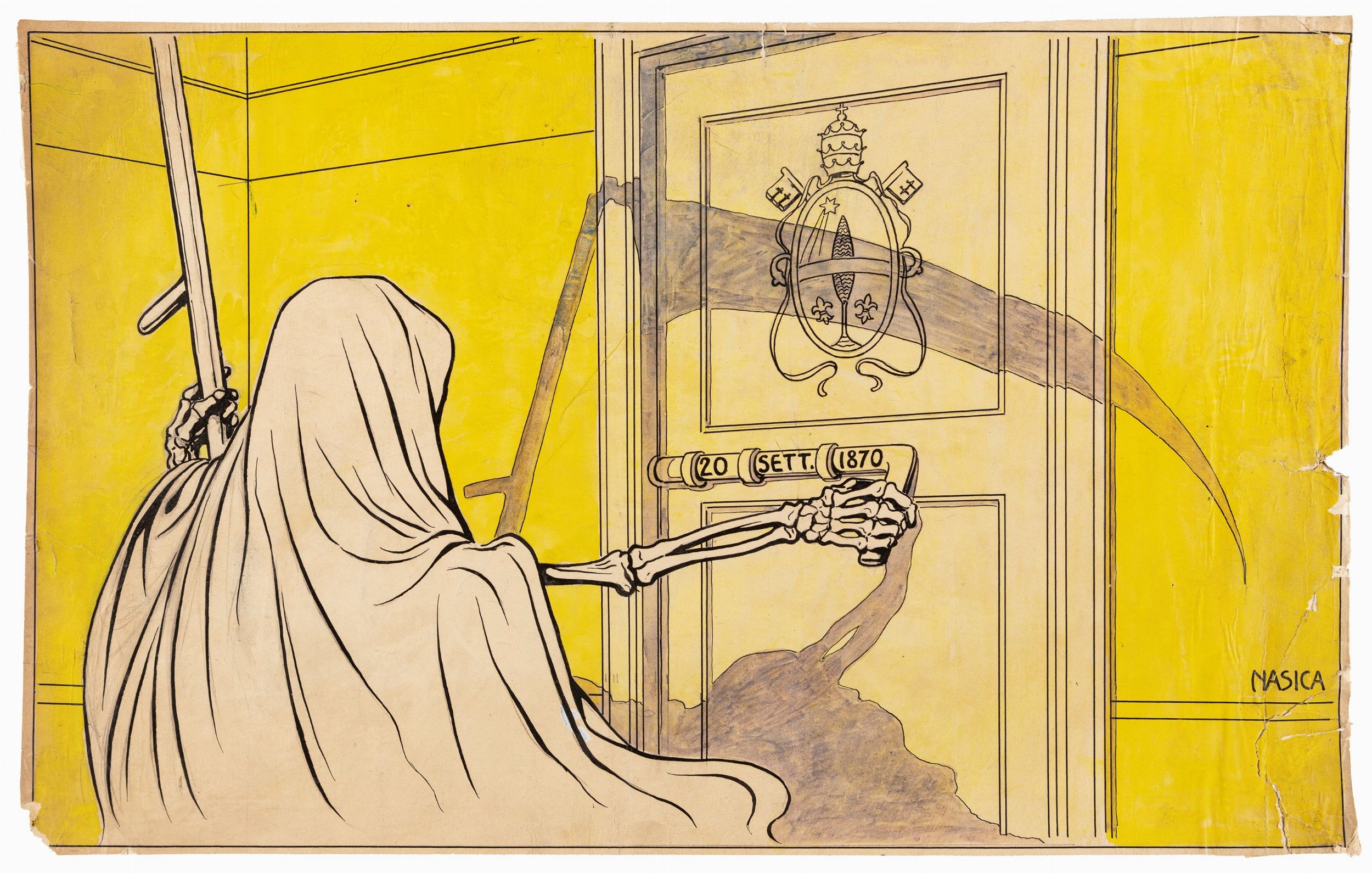 primi del 900 Illustrazione originale realizzata da Nasica durante i primi anni del '900. Al retro: << La Liberatrice. / Liberato il prigioniero, rimarrà aperta la porta? >> Maestro all'Accademia di Belle Arti di Bologna di Giorgi Morandi e Bruno Saetti, Nasica fu tra gli illustratori più apprezzati della sua epoca, definito il caricaturista degli intellettuali, lavorò tra le altre per le riviste Italia ride, Novissima, Fantasio, La Lettura e il Secolo XX. Strappi, pieghe e mancanze ai margini. Firmata.