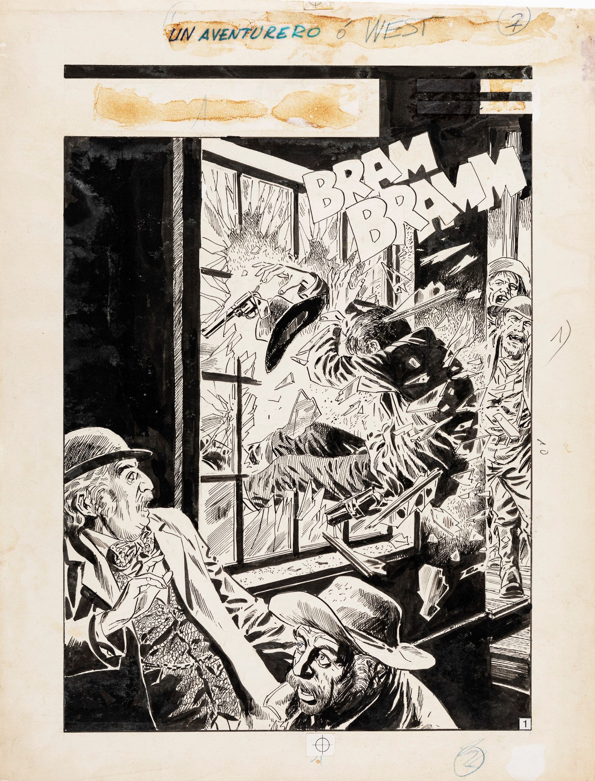 matita e china su cartoncino, 34,5 x 45,5 cm 1986 Tavola originale realizzata da Martinez per il cap. 1 pag. 1 della celebre saga L'avventuriero, pubblicata per la prima volta in Italia sulla rivista Skorpio n. 45 dalla Eura Editoriale nel 1986. Lievi pieghe al margine superiore e tracce di umidità.