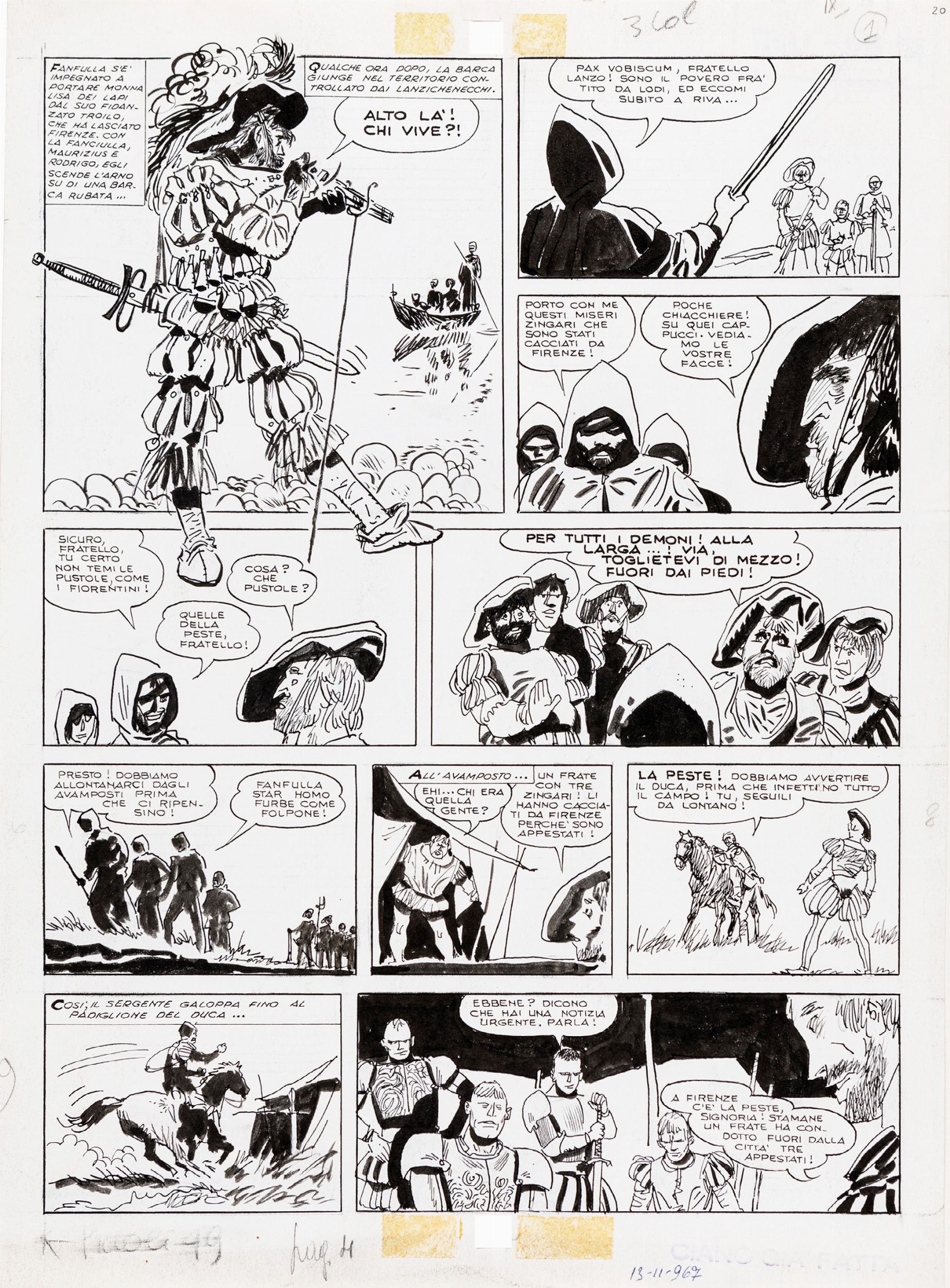 matita e china su cartoncino, 28 x 37,5 cm 1967 Tavola originale realizzata da Pratt per Le avventure di Fanfulla, pag. 20 di questa avventura che narra le gesta del soldato di ventura Fanfulla da Lodi, pubblicata per la prima volta a episodi sulle pagine del CdP tra il 1967 e il 1968. Colorata al retro a tempera.