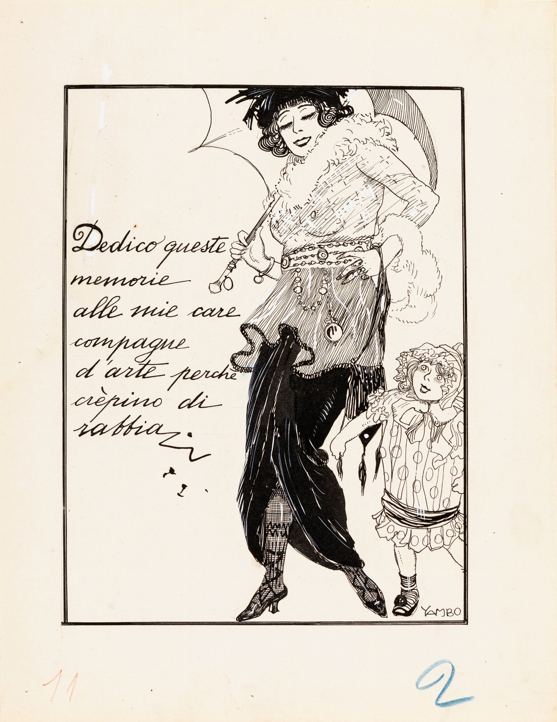 1920 Illustrazione originale realizzata da Yambo per un fascicolo de Le memorie di una Sciantosa, edito dalla Nerbini nel 1920. Firmata.