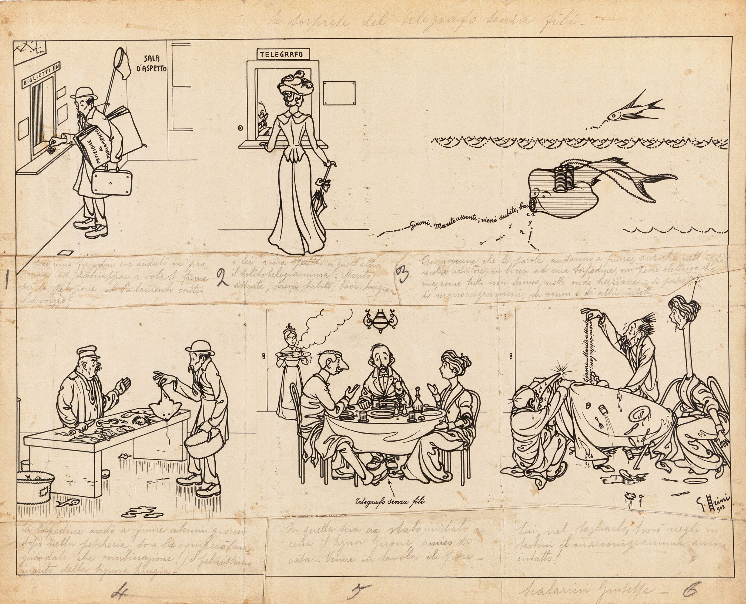 matita e china su cartoncino rimontato, 42 x 34 cm 1903 Illustrazione originale realizzata da Scalarini nel 1903 per il settimanale illustrato Merlin Cocai. È ìl più politico dei caricaturisti italiani e forse del mondo. La sintesi è la base del suo pensiero e del suo disegno crudele. (...) La sua caricatura è veleno, è morte. Guardando queste grandi opere io mi spavento. Scalarini è un caricaturista che passerà alla storia (Emilio Zanzi). Provenienza: collezione Caramba (Luigi Sapelli). Alcune pieghe e piccolo strappo al margine inferiore. Firmata e datata.