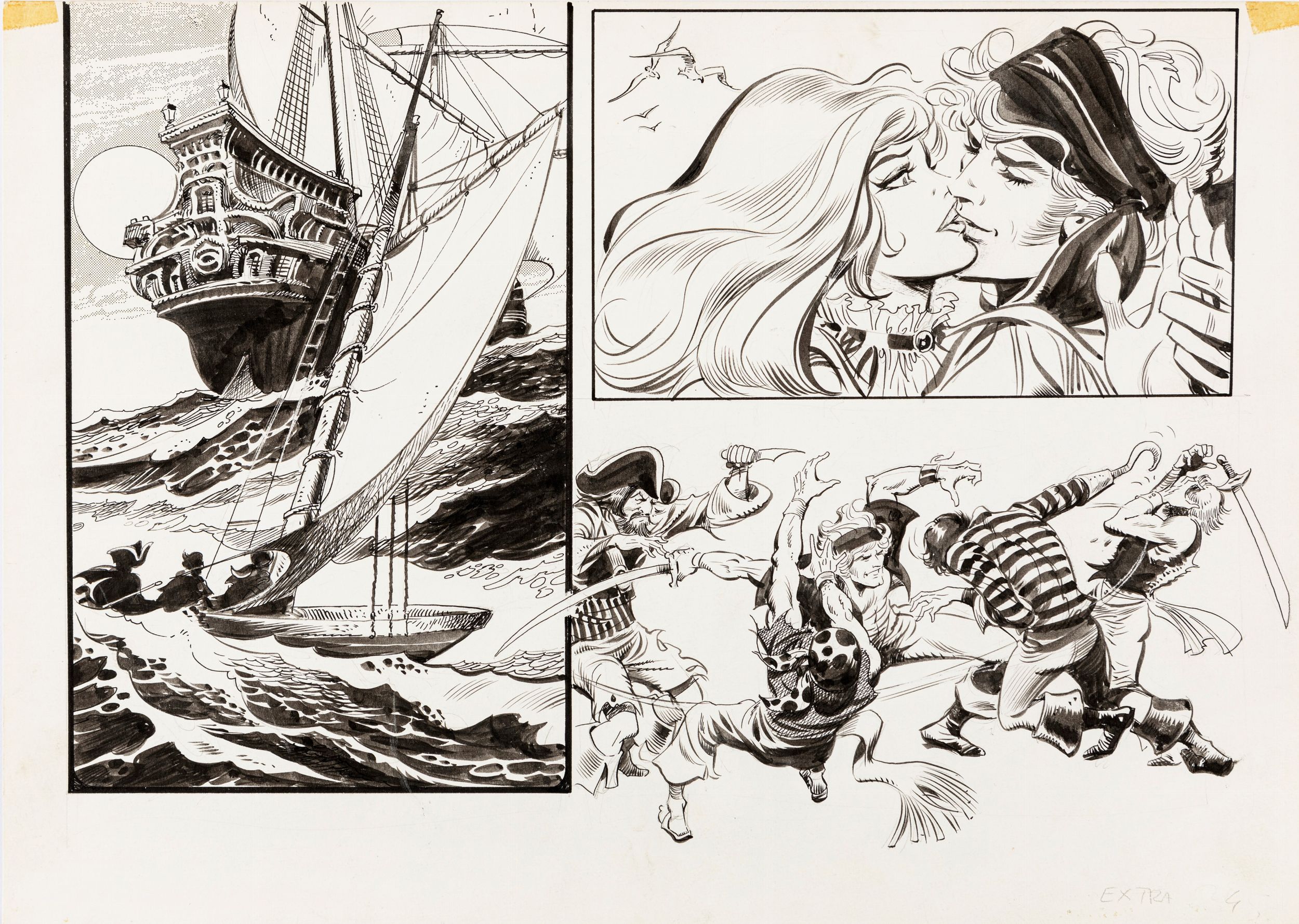 matita e china su cartoncino, 35,5 x 25,5 cm anni 80 Tavola originale realizzata da Frollo durante gli anni '80 per presentare il suo nuovo personaggio all'editore Barbieri, inizialmente concepito con il titolo di Lord Flint (come si evince dalla scritta sul retro di questa tavola) il nome cambierà poi in Lord Tigre. L'intera storia, personale omaggio del maestro veneziano ai vecchi film di pirati (Il corsaro dell'isola verde in particolare) rimase inedita fino al 1996 quando venne pubblicata dalla A.N.A.F.I., inclusa la tavola qui presentata.