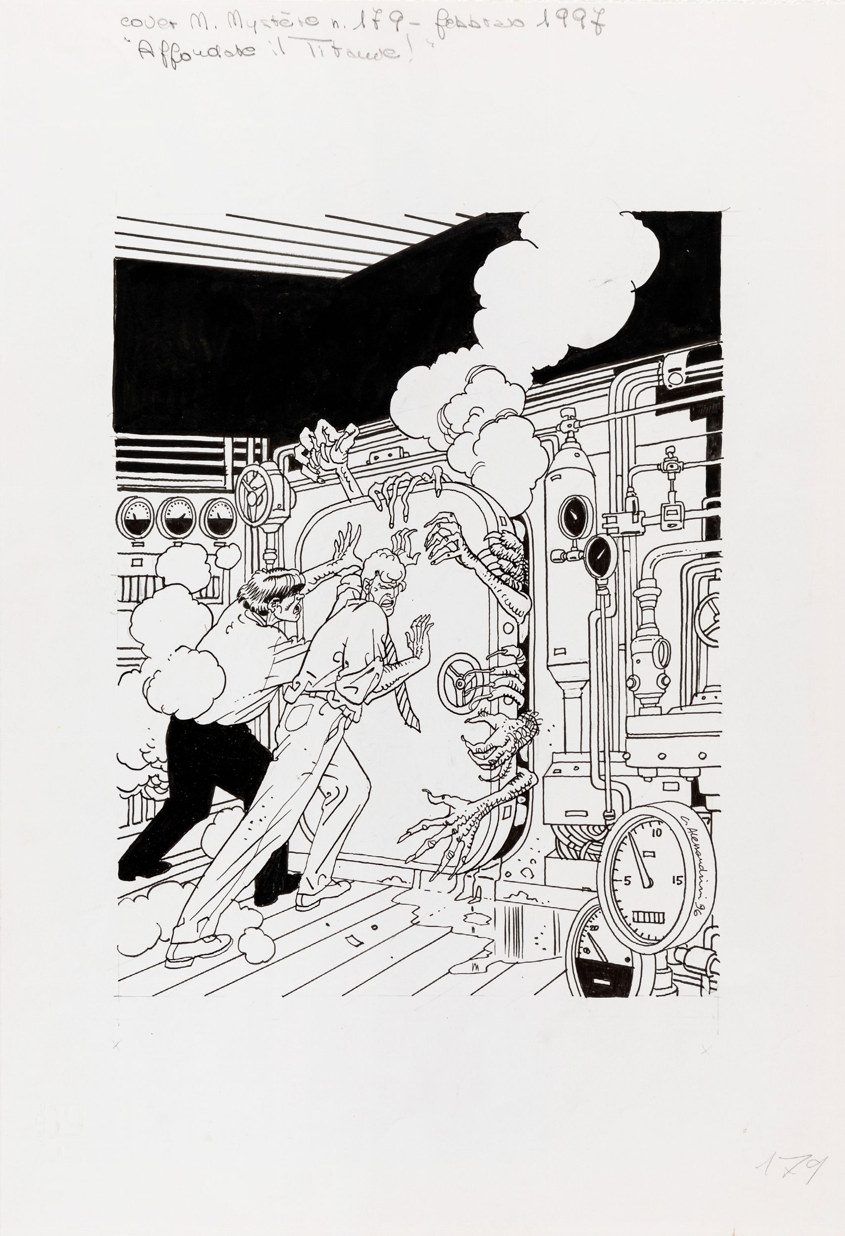 1996 Originale di copertina realizzato da Alessandrini per Affondate il Titanic!, edito su Martin Mystère n. 179 dalla Bonelli nel 1997. Firmato e datato.