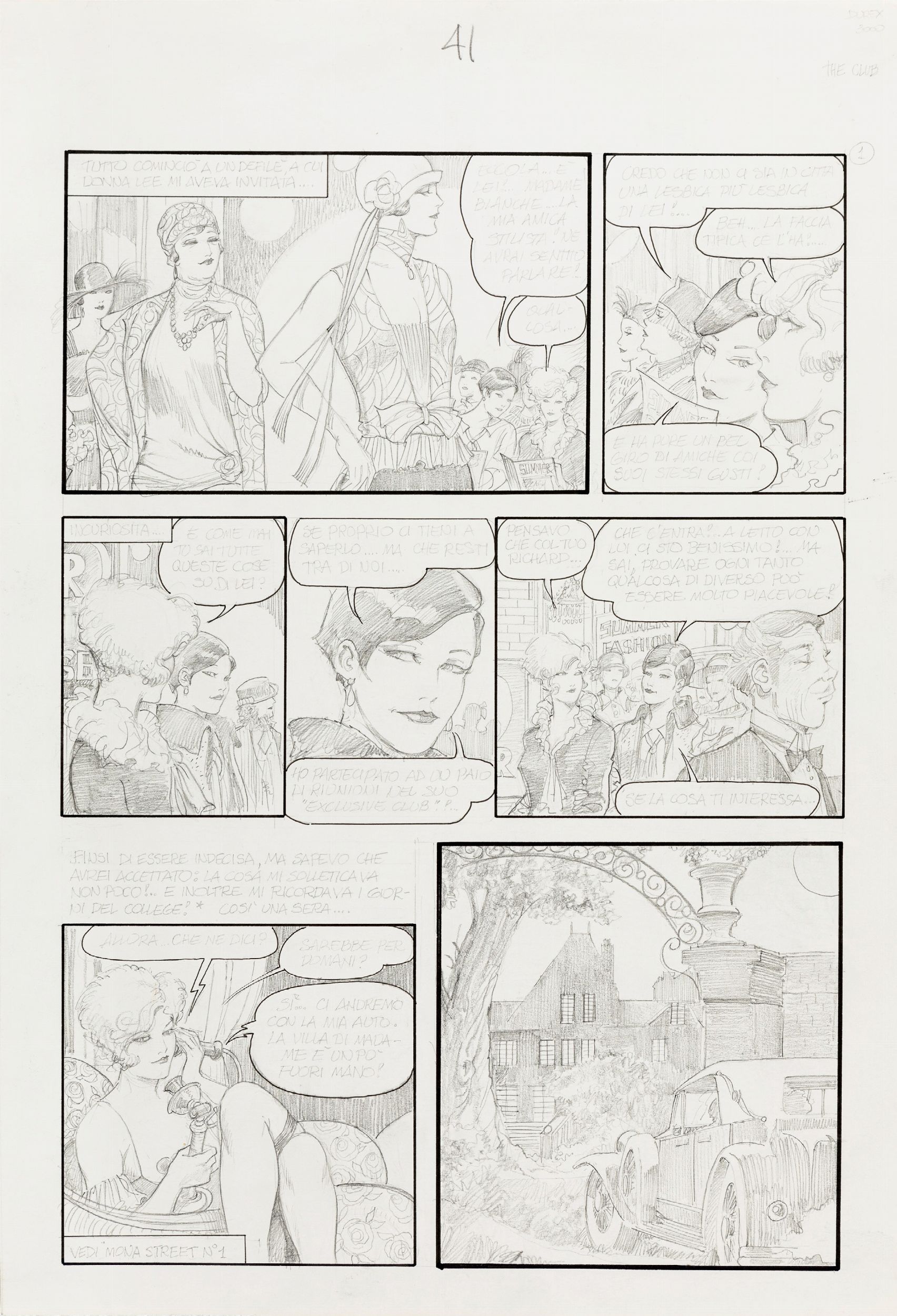 1995 Tavola originale realizzata da Frollo per Il club di madame, avventura erotica della sua Mona edita a pag. 1 nel volume Mona Street 3: The Secret Books of Glamour dalla Glamour International nel 1995. Pubblicata in Francia nello stesso anno con il titolo Le club de madame, segna la consacrazione di Frollo nell'Olimpo del fumetto erotico d'autore a livello mondiale. Siamo nella Boston degli anni Venti del Novecento, Mona Street è una scaltra fanciulla da poco uscita dal college, curve morbide candidamente ostentate, un viso innocente dallo sguardo ironico e un sorriso appena accennato sulle labbra. Mona Street è un normale nome inglese, ma se si pensa che Leone Frollo è veneziano allora il giocoso equivoco verbale diventa intuitivo. L'ammiccamento malizioso c'è già nel nome, dunque, ma tutte le storie di Mona Street sono sottese di ammorbante erotismo, ingegnosamente narrate dall'autore che, con un tratto morbido e voluttuoso a matita o china, ha tracciato un personaggio ben diverso dalle altre eroine del fumetto quasi sempre succubi dell'uomo: Mona ha una personalità da falsa ingenua che si prende gioco di tutti, diventando a volte vindice del proprio sesso.