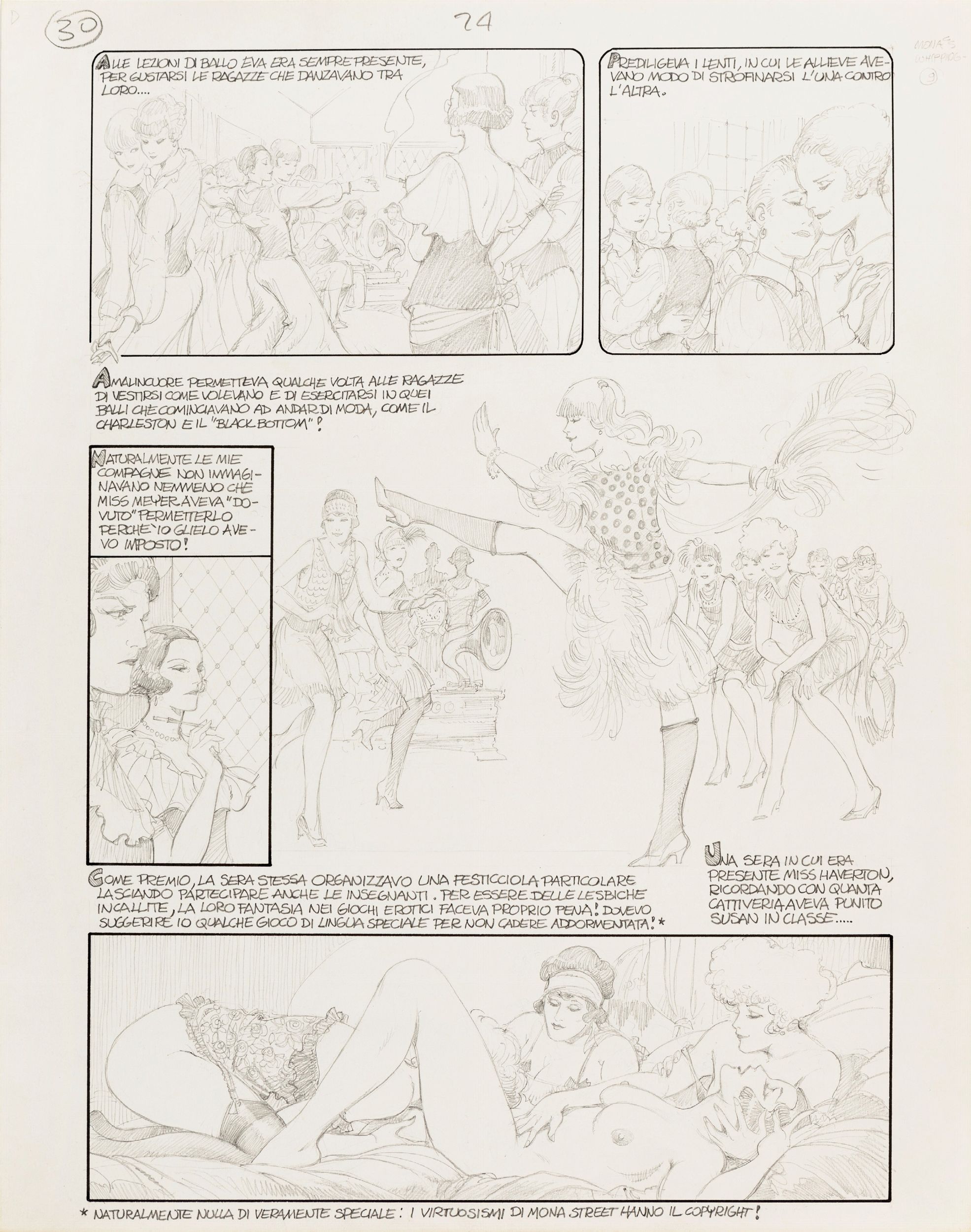 1988 Tavola originale realizzata da Frollo per Mona's whipping, avventura erotica della sua Mona edita a pag. 9 nel volume Mona Street 1: The Secret Books of Glamour dalla Glamour International nel 1988. Pubblicata in Francia nello stesso anno con il titolo Mona's whipping, segna la consacrazione di Frollo nell'Olimpo del fumetto erotico d'autore a livello mondiale. Siamo nella Boston degli anni Venti del Novecento, Mona Street è una scaltra fanciulla da poco uscita dal college, curve morbide candidamente ostentate, un viso innocente dallo sguardo ironico e un sorriso appena accennato sulle labbra. Mona Street è un normale nome inglese, ma se si pensa che Leone Frollo è veneziano allora il giocoso equivoco verbale diventa intuitivo. L'ammiccamento malizioso c'è già nel nome, dunque, ma tutte le storie di Mona Street sono sottese di ammorbante erotismo, ingegnosamente narrate dall'autore che, con un tratto morbido e voluttuoso a matita o china, ha tracciato un personaggio ben diverso dalle altre eroine del fumetto quasi sempre succubi dell'uomo: Mona ha una personalità da falsa ingenua che si prende gioco di tutti, diventando a volte vindice del proprio sesso.