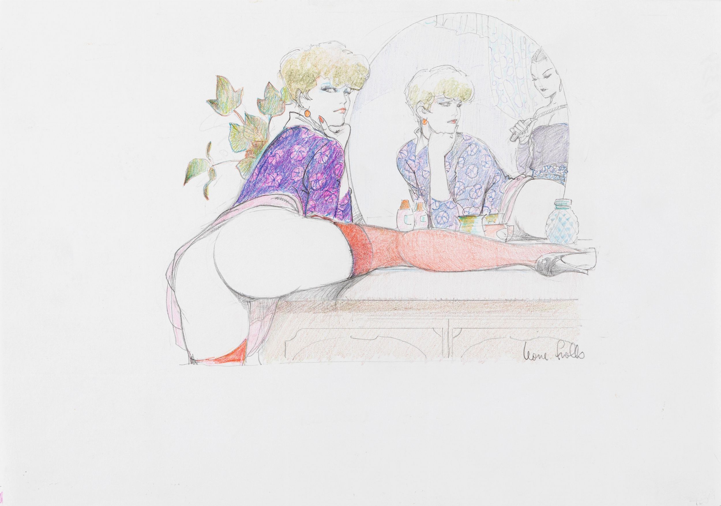 matita e pastelli su cartoncino, 30 x 21 cm anni 90 Illustrazione originale realizzata da Frollo durante gli anni '90, una raffinata e seducente visione del maestro veneziano dell'eros. Opera pubblicata sul volume Leone Frollo: Unpublished Color Works dalla Glamour nel 1993. Firmata.