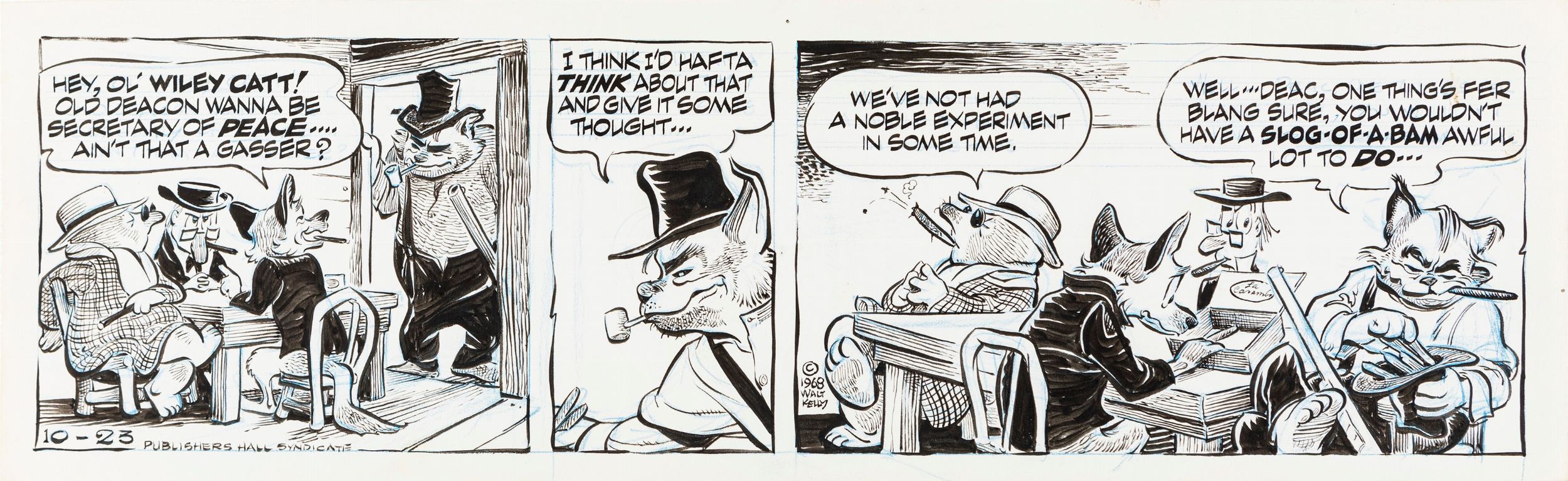 pastello e china su cartoncino, 53,5 x 16,5 cm 1968 Striscia giornaliera del23/10/1968 per Pogo. Strip incentrata sulla campagna presidenziale del 1968, con quattro cattivi della palude: Wiley Cat, Seminole Sam, Molester Mole e Deacon Mushrat. Firmata e datata.
