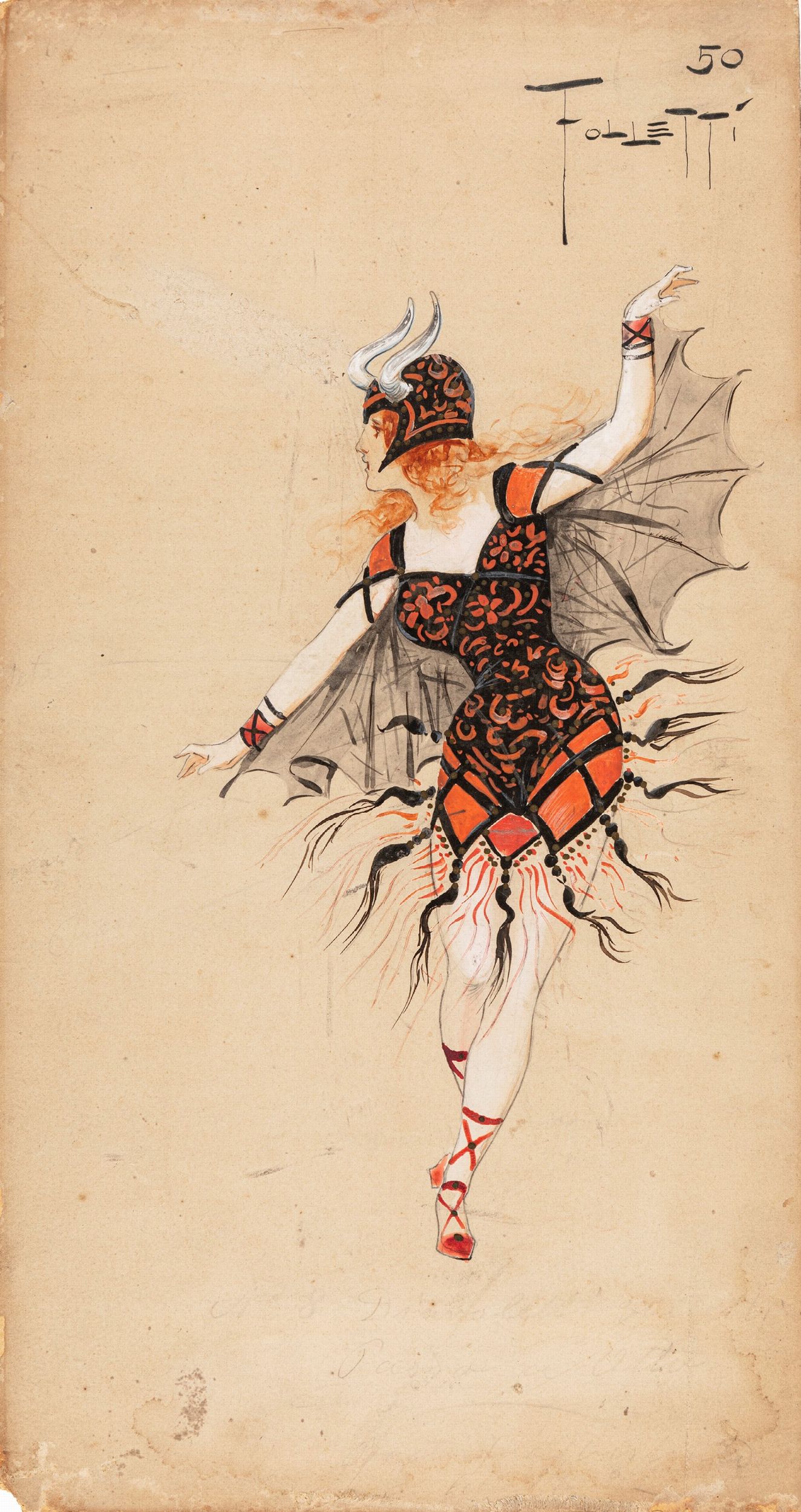 primi del 900 Illustrazione originale realizzata da Villa come figurino teatrale commissionato dalla storica Sartoria Chiappa, fornitrice ufficiale del Teatro alla Scala di Milano dal 1899 al 1918. Al retro indicazioni a penna per stoffe, materiali e accessori. Piccola mancanza all'angolo inferiore sinistro.