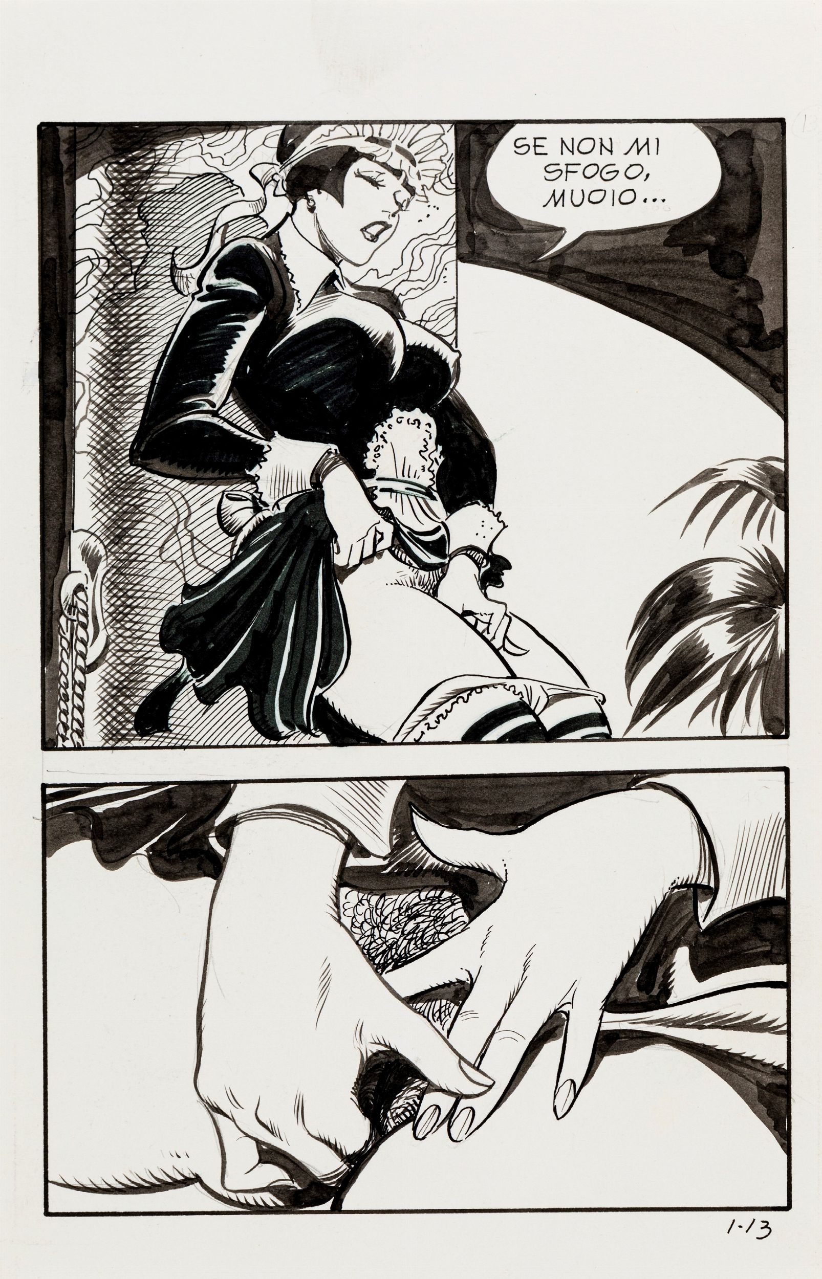 matita e china su cartoncino, 15 x 22,5 cm 1988 Tavola originale realizzata da Frollo per Villa Orgasmo, edita su Storie erotiche n. 1 a pag. 13 dalla Edifumetto nel 1985. << Alle porte di Roma, circondata da un incantevole giardino, sorge Villa Orgasmo, di proprietà del Visconte Aldobrando Ranuccio Caldobaldi, noto gaudente della capitale. Una vita interamente dedicata ai piaceri... >>.