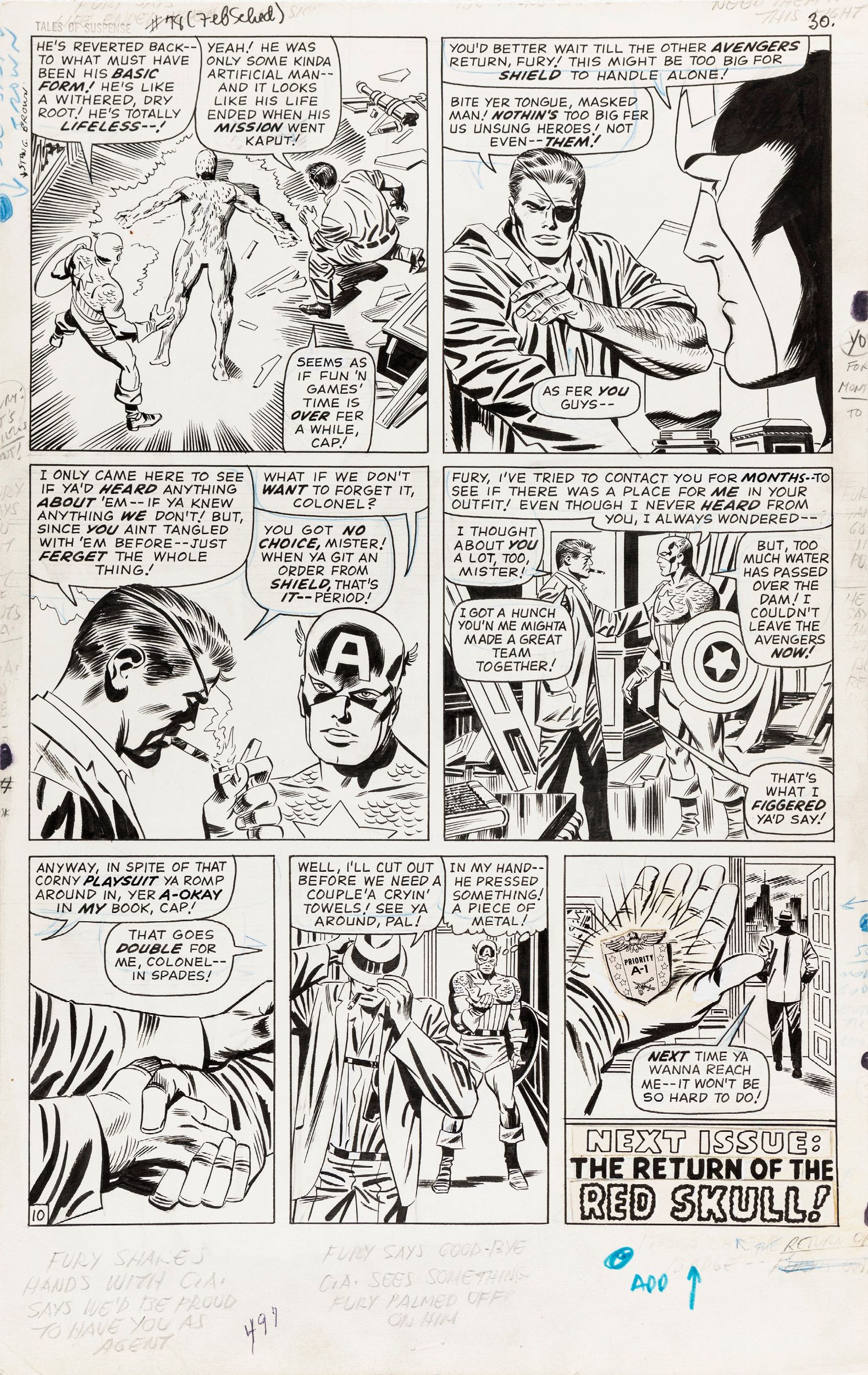 1966 Tavola originale realizzata da Kirby per THEM!, pubblicata su Tales of Suspense n. 78 a pag. 10 dalla Marvel nel 1966. In questa storia scritta a quattro mani da Stan Lee e Jack Kirby va in scena un episodio fondamentale nella storyline di Captain America, dopo il loro ultimo incontro durante la Seconda Guerra Mondiale (Sgt. Fury and his Howling Commandos n. 13, del 1964) Cap e Nick Fury combattono di nuovo fianco a fianco per fronteggiare l'organizzazione criminale conosciuta come THEM. In questa pagina conclusiva della storia Capitan America spiega che stava cercando da tempo di contattare Fury per unirsi allo SHIELD, ma decide di non rinnovare sua offerta perché ha ormia preso un impegno con i Vendicatori; Fury, tuttavia, lascia a Captain America un distintivo SHIELD priorità A-1 nel caso in cui avesse mai bisogno dell'aiuto dello SHIELD in una missione futura, dando così inizio a quella che è forse la saga più celebre della Marvel. Chine di Frank Giacoia. Lieve piega all'angolo inferiore sinistro.