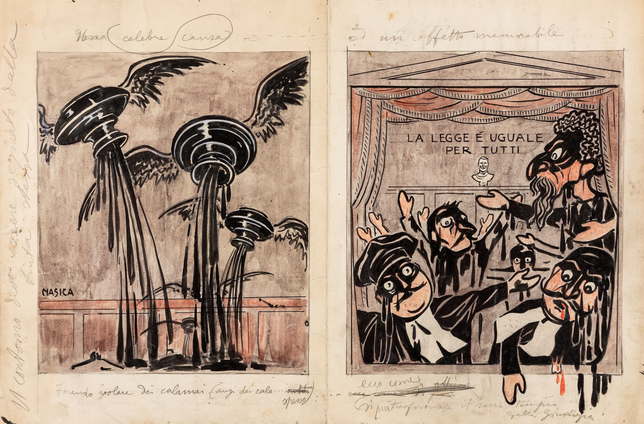 primi del 900 Illustrazione originale realizzata da Nasica durante i primi anni del '900. << Facendo volare dei calamai (anzi dei cala...spesso)... ecco come si può trasformare il sacro tempio della Giustizia >>. Maestro all'Accademia di Belle Arti di Bologna di Giorgi Morandi e Bruno Saetti, Nasica fu tra gli illustratori più apprezzati della sua epoca, definito il caricaturista degli intellettuali, lavorò tra le altre per le riviste Italia ride, Novissima, Fantasio, La Lettura e il Secolo XX. Piega verticale al centro. Firmata.