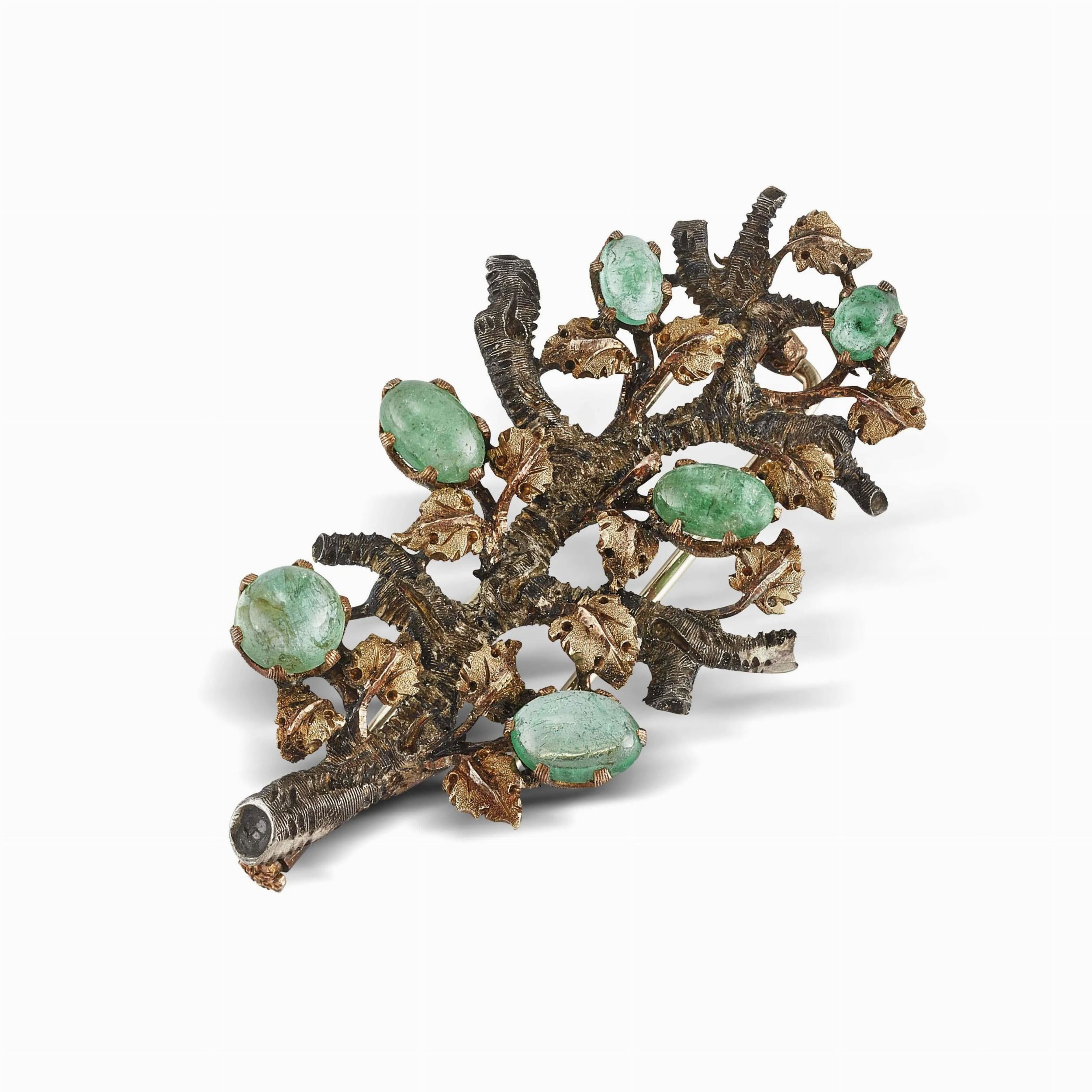 in oro e argento, realizzato a forma di tralcio con foglie e sei smeraldi taglio cabochon per ct 1.70 circa, firmata Buccellati, dim. cm 2,5x4,5, gr. 11