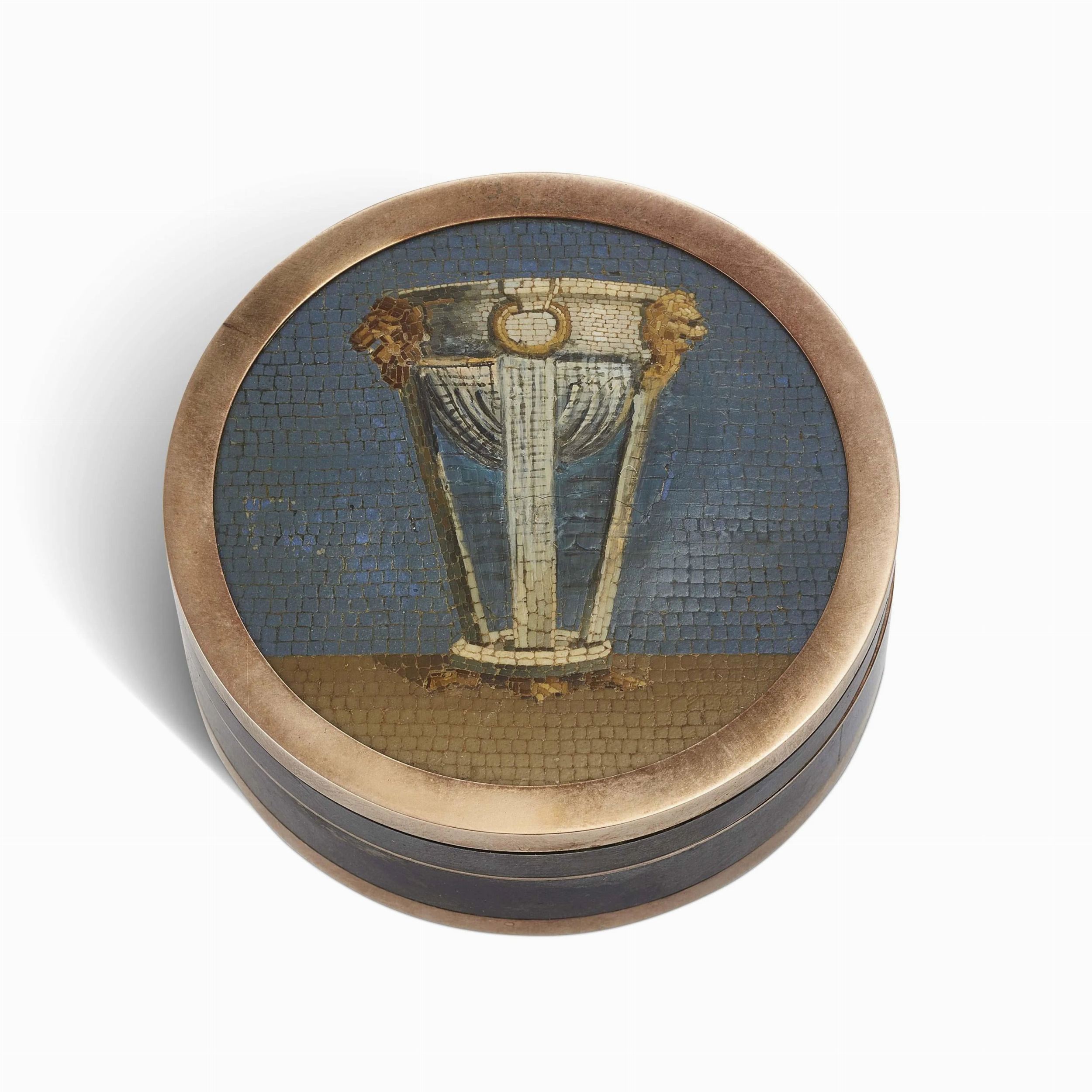 in argento, con bordatura in oro, di forma rotonda, placca centrale con micromosaico su cassina in rame raffigurante un tripode, firmata sul retro Giacomo Raffaelli Fece Roma 1783, dim. cm 6,5x6,5x2,5 circa, gr. 212