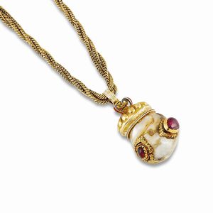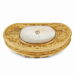 PICCOLA TABACCHIERA in oro giallo e madreperla, lavorata a incisione, con corpo e coperchio raffiguranti [..]