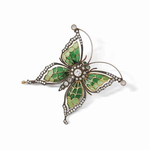 BUCCELLATI SPILLA A FORMA DI RAMO in oro e argento, realizzato a forma di tralcio con foglie e sei smeraldi [..]
