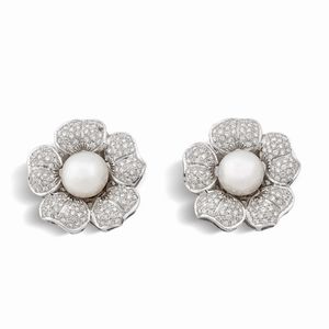 PAIO DI ORECCHINI A FORMA DI FIORE CON PERLE E DIAMANTI