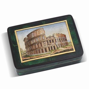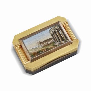 TABACCHIERA IN ORO GIALLO in oro giallo 18kt, base e profilo con ghirlande e tralci incisi, coperchio [..]