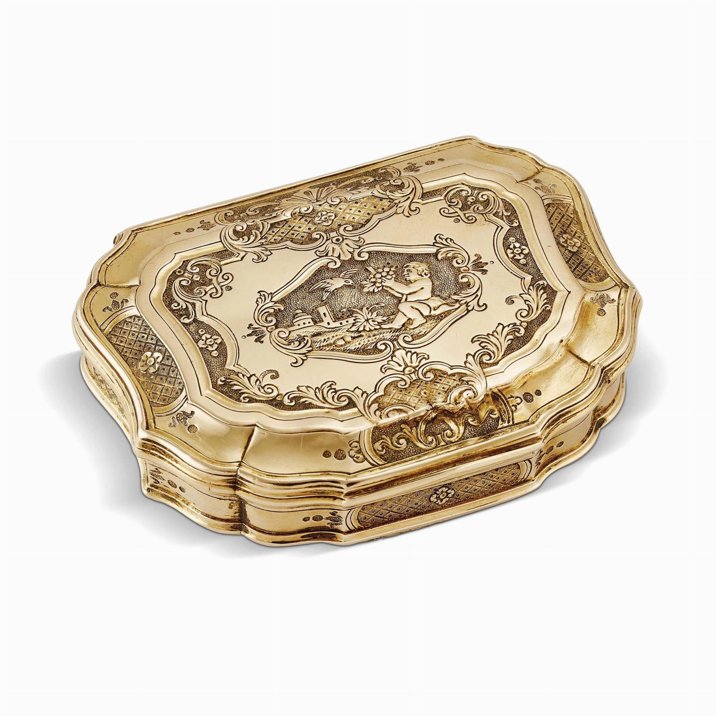 in oro giallo, dai lineamenti ondulati, corpo e coperchio lavorati a incisione, con al centro un motivo campestre cinto da tralci e ghirlande, recante uno scompartimento iterno apribile con piccolo cucchiaio, dim. cm 5x4x2 circa, gr. 44