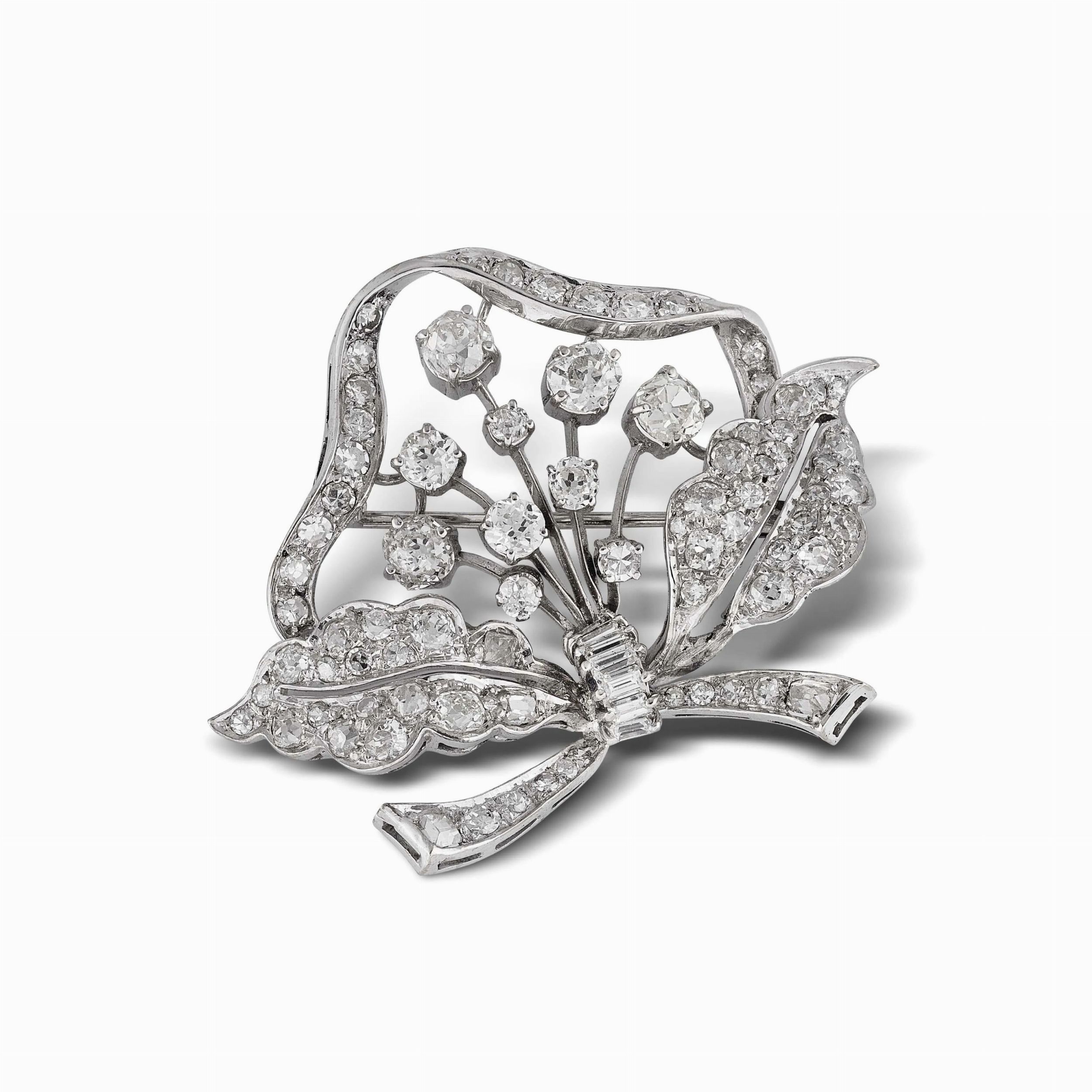 in oro bianco 18kt, impreziosita da diamanti taglio vecchio per ct 3.80 circa, firmata Scortecci, dim. cm 5x4 circa, gr. 13