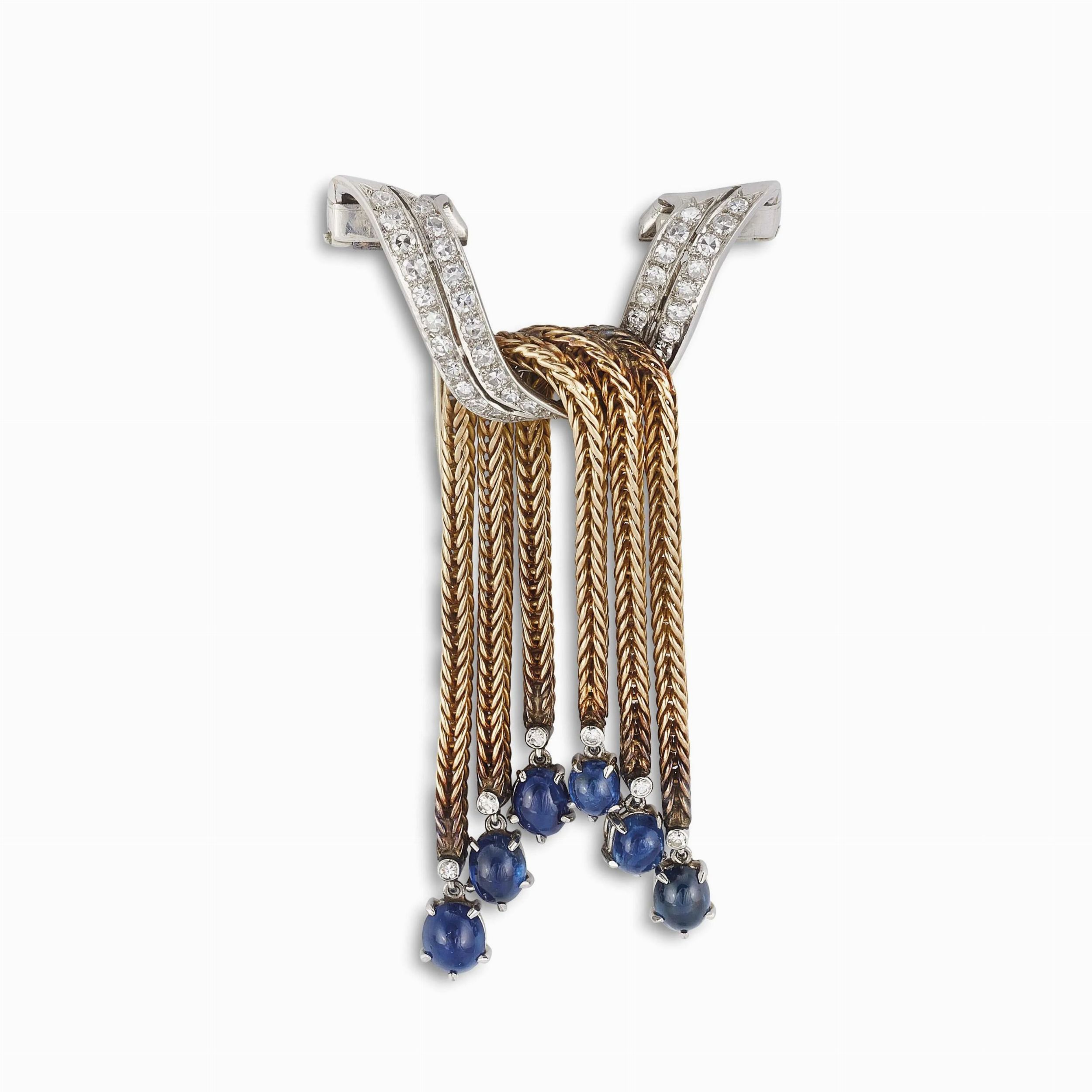 SAPPHIRE AND DIAMOND RIBBON BROOCH IN 18KT TWO TONE GOLD