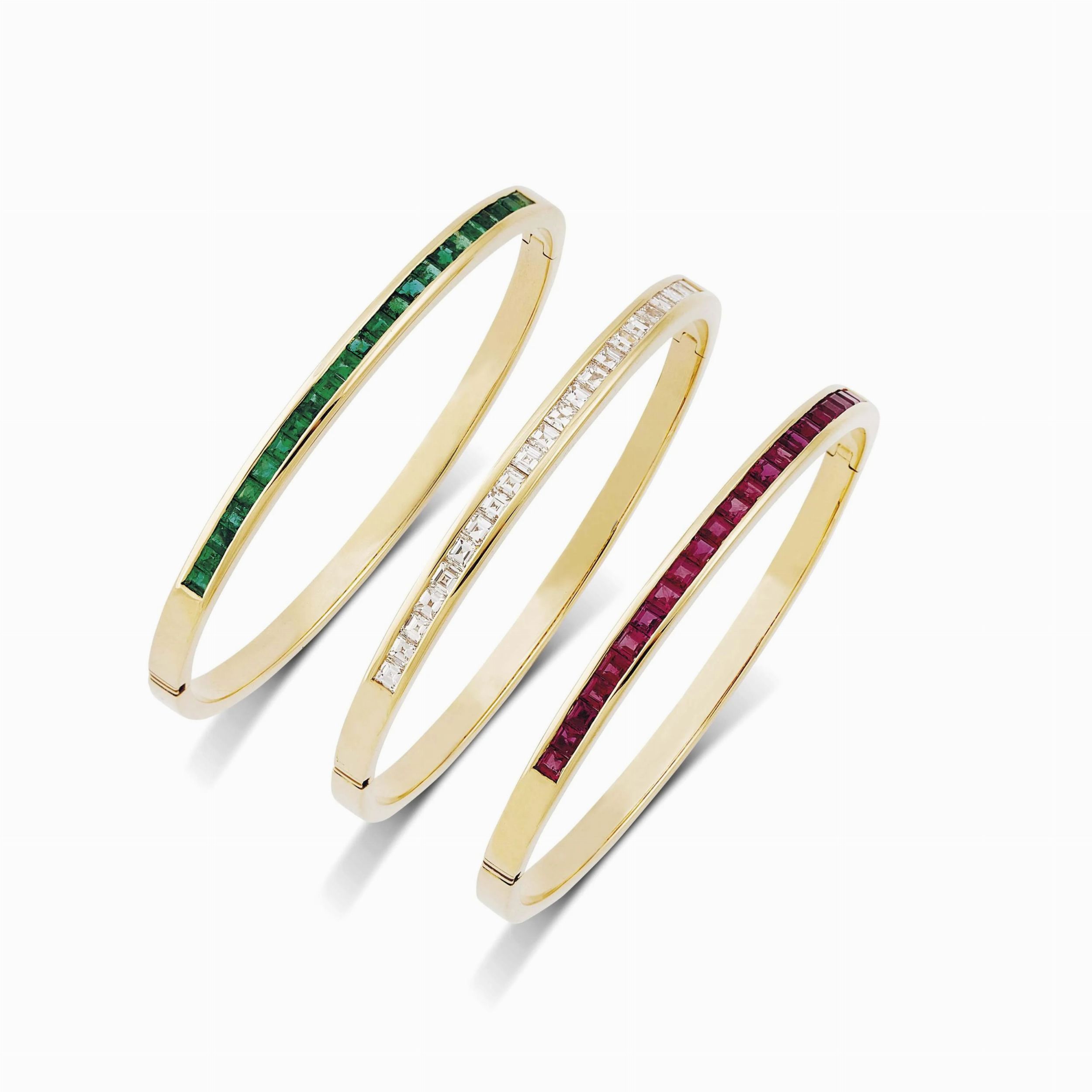 in oro giallo 18kt, di cui uno impreziosito da una fila di rubini taglio carré per ct 3 circa, un secondo bracciale con una fila di smeraldi taglio carré per ct 2.10 circa, terzo bracciale con diamanti taglio carré per ct 2.60 circa, punzoni 750 e del fabbricannte, dim. mm 63x56, diam. interno mm 59, circonferenza mm 57, gr. 48 complessivi