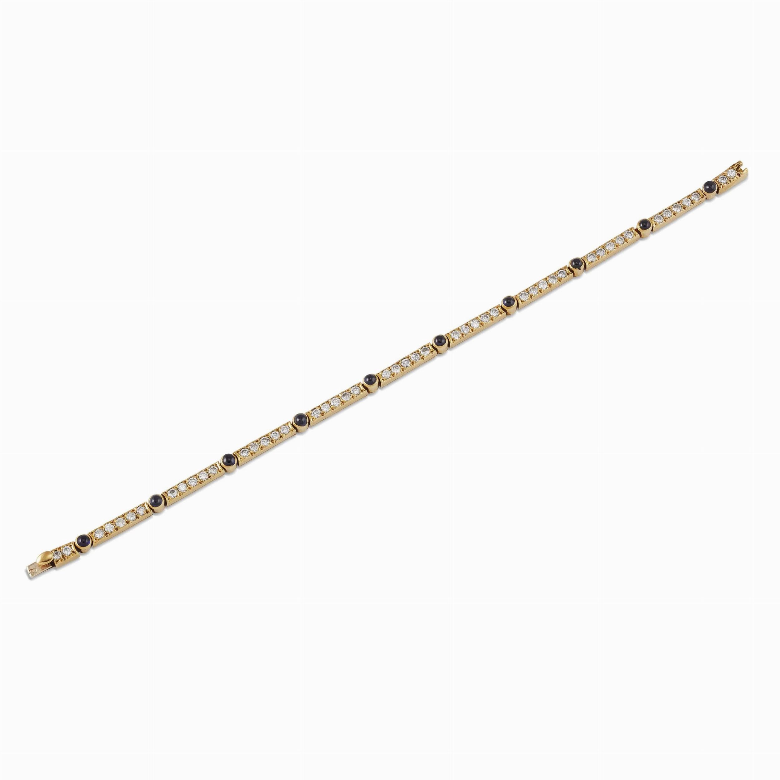 in oro giallo 18kt, impreziosito da una fila di diamanti taglio brillante (uno mancante) per ct 1.90 circa, alternati a zaffiri taglio cabochon per ct 0.70 circa, firmato VCA, punzone francese, del fabbricante e n. seriale, lungh. cm 17,5, gr. 13