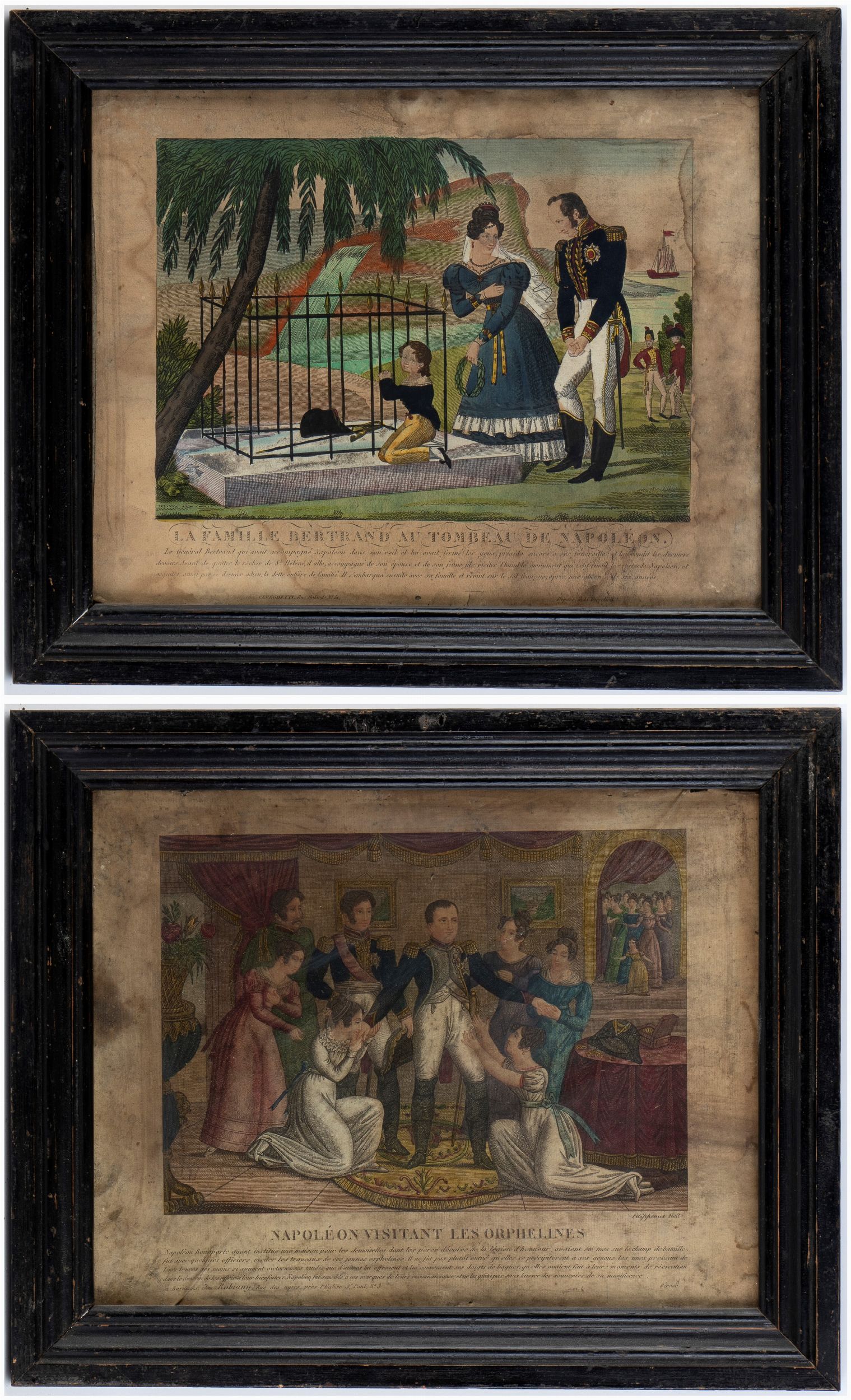 Stampe policrome in cornice raffiguranti La famiglia Bertrand sulla tomba di Napoleone; Napoleone che fa visita alle orfanelle. Una stampa presenta rottura del vetro.