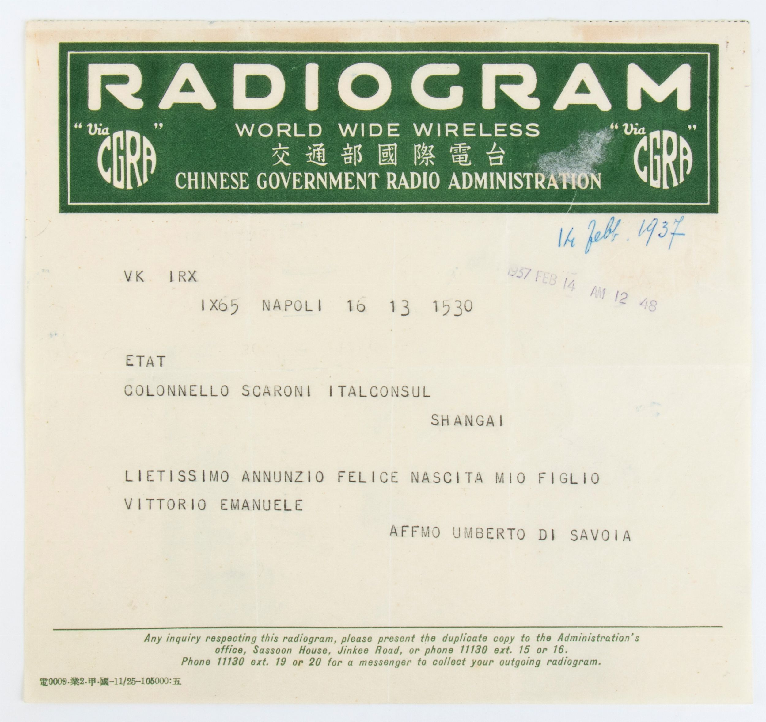 Governo nazionalista della Repubblica Cinese, radiogramma di Umberto di Savoia al [..]