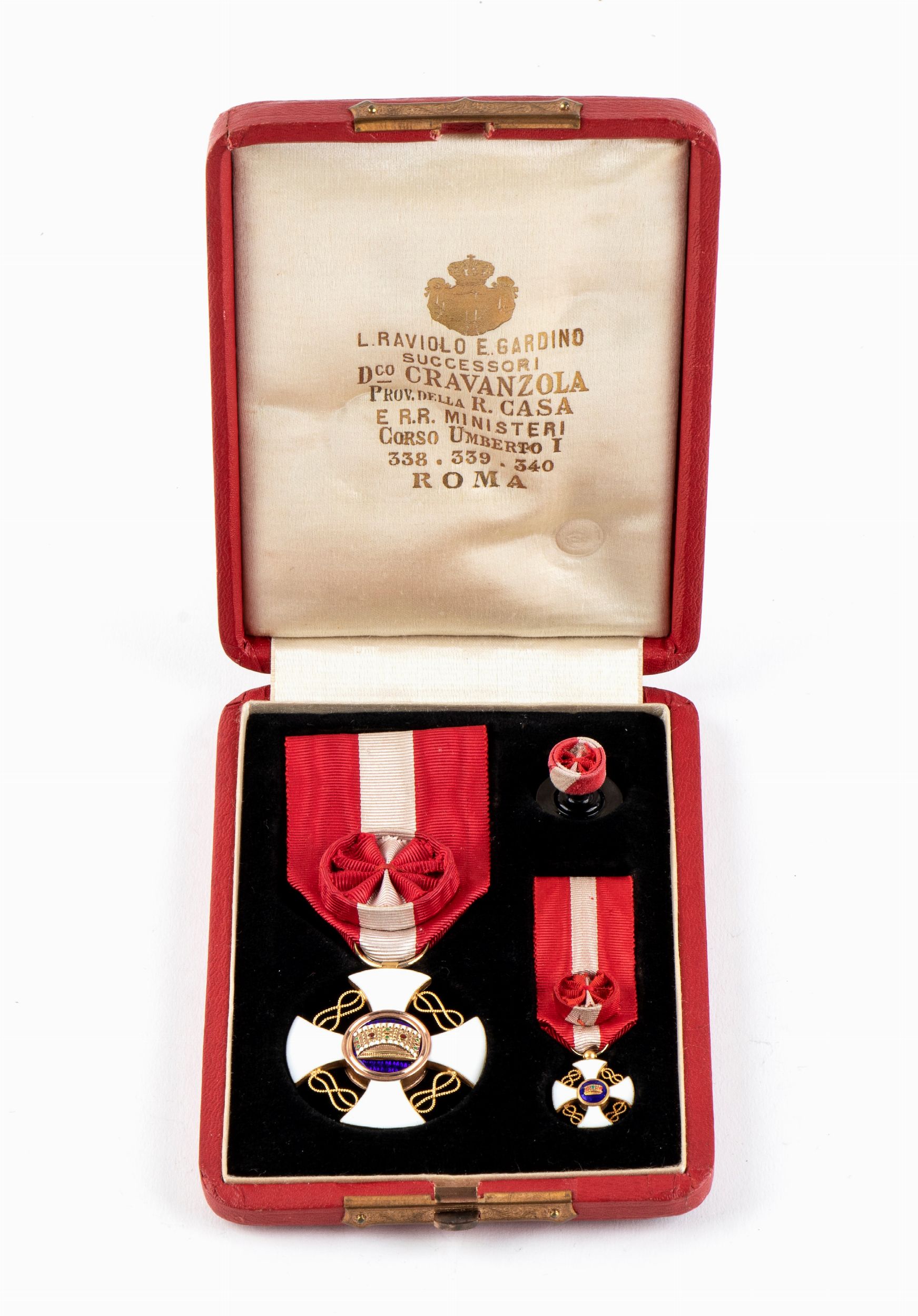 prima metà XX sec. Bell'insieme di insegna e miniatura dell'Ordine, in oro e smalti, in astuccio con marchi del fabbricante, Cravanzola Roma