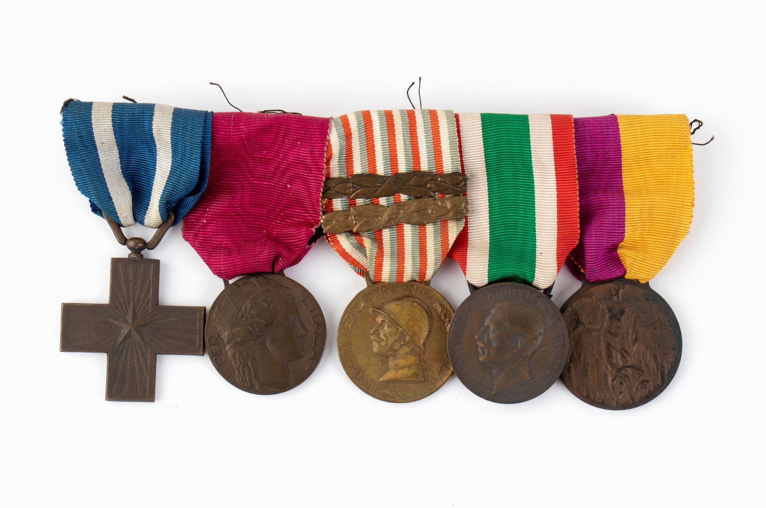 primo quarto XX sec. Medagliere composto da una croce di guerra, volontario I GM, medaglia della Grande Guerra con due barrette, Unità d'Italia e Marcia su Roma, in buono stato, montato in origine,