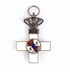 primo quarto XX sec. Commenda con nastro da collo in seta marezzata, difetti agli smalti, placca in argento gettato, [..]