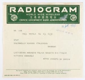 Governo nazionalista della Repubblica Cinese, radiogramma di Umberto di Savoia al [..]
