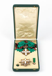 prima metà XX sec. Bell'insieme di insegna e miniatura dell'Ordine, in oro e smalti, in astuccio con marchi del [..]