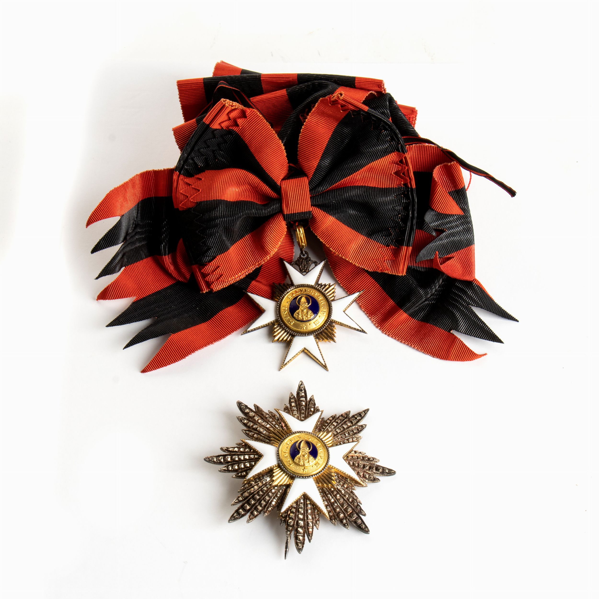 prima metà XX sec. bellissima insegna di gran croce, placca in argento cesellato con applicazioni in smalto ,al verso placchetta con marchio del fabbricante fascia di seta marezzata e pendente in argento dorato e smalti, in ottimo stato