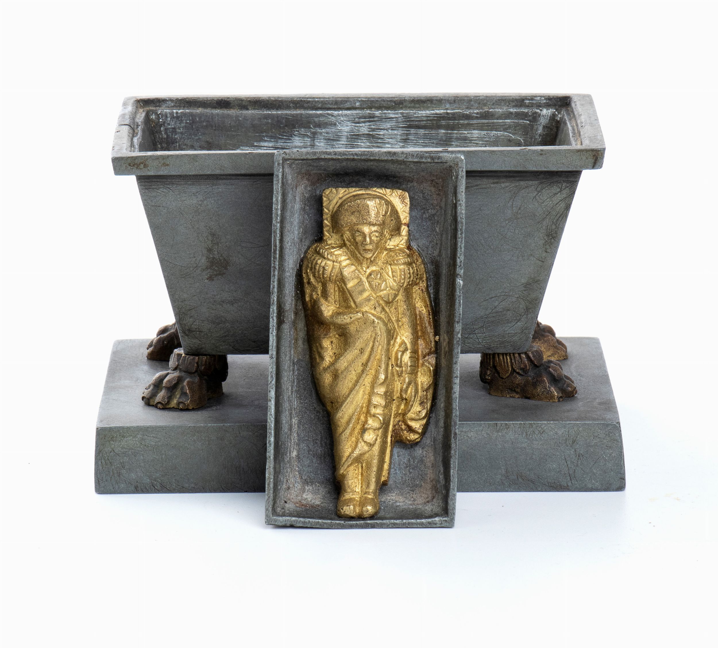 Piccolo sarcofago in metallo bianco e bronzo contenente un calamaio e le spoglie [..]