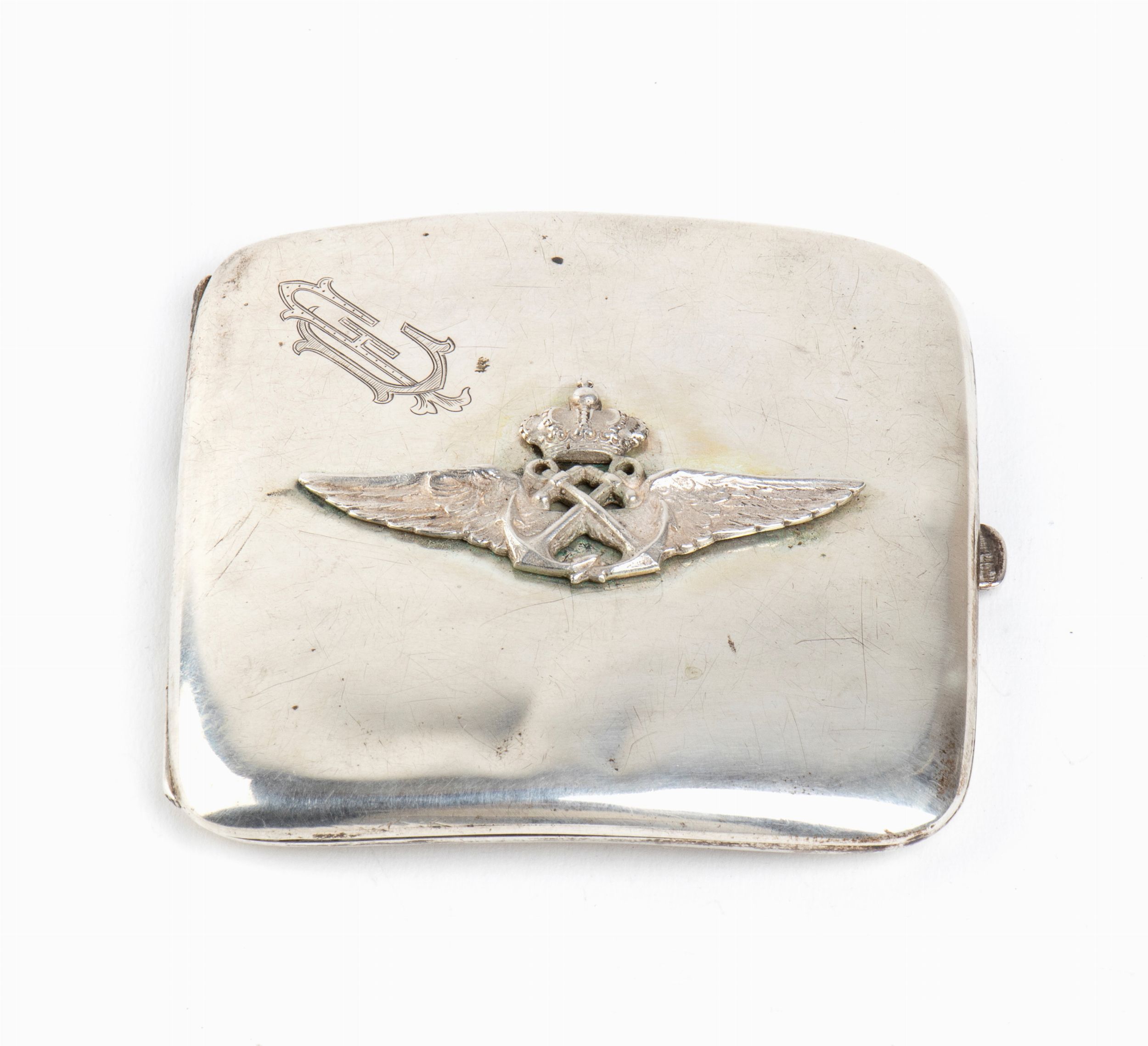 prima metà XX sec. Portasigarette in argento con applicato distintivo da comandante di dirigibile in argento, iniziali del proprietario incise , in ottimo stato.