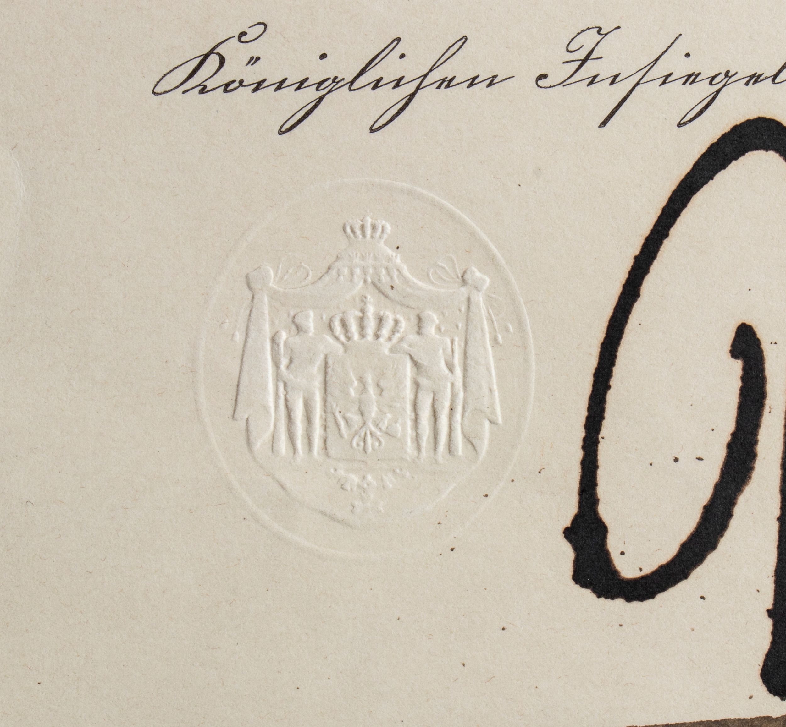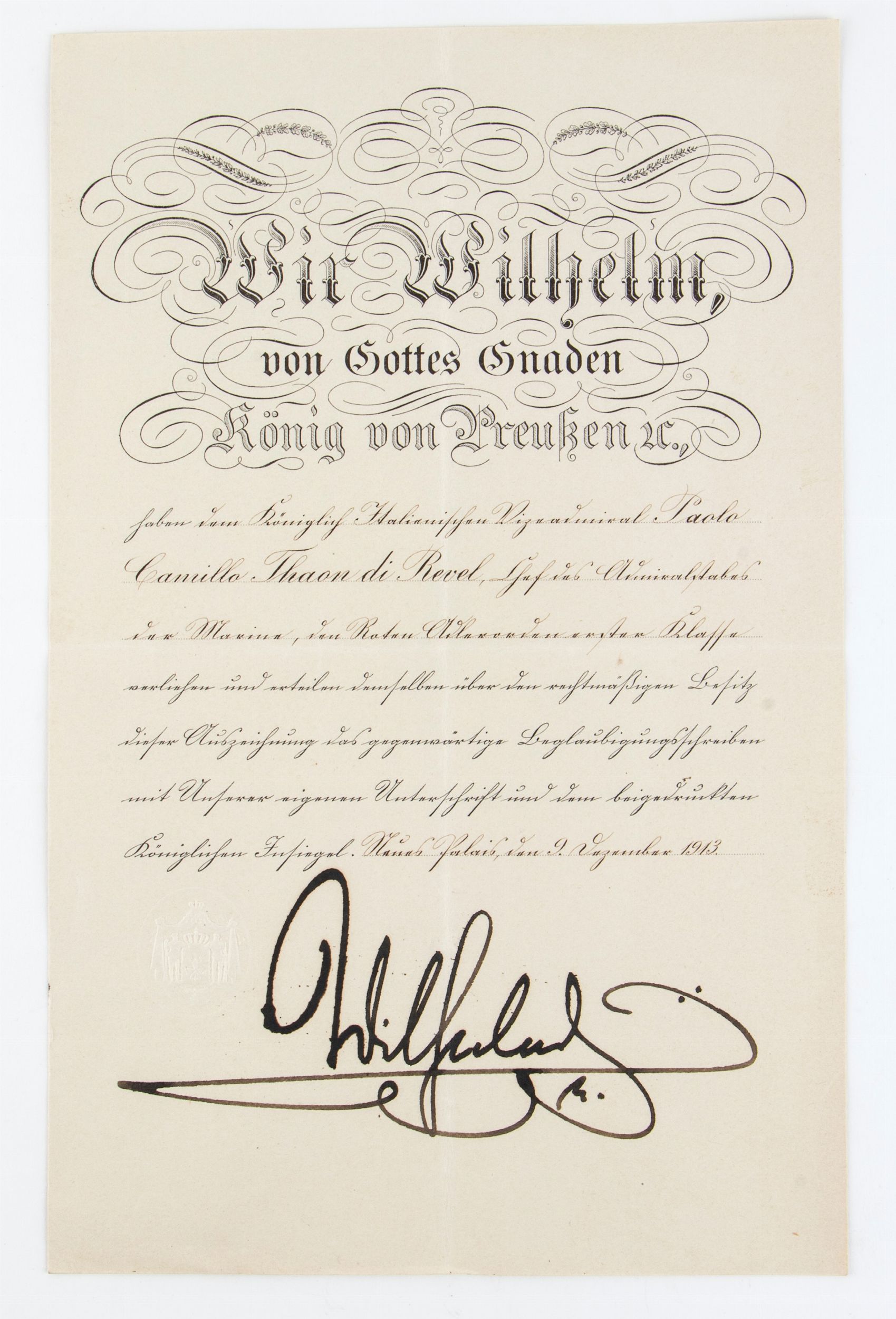 Set di gran Croce composto da placca in argento con centrale in smalti, pendente in oro e smalti marcato N, Neuhaus & son Berlin al braccio inferiore, fascia di seta e diploma di concessione firmato per esteso dall'Imperatore Guglielmo, in ottimo stato.