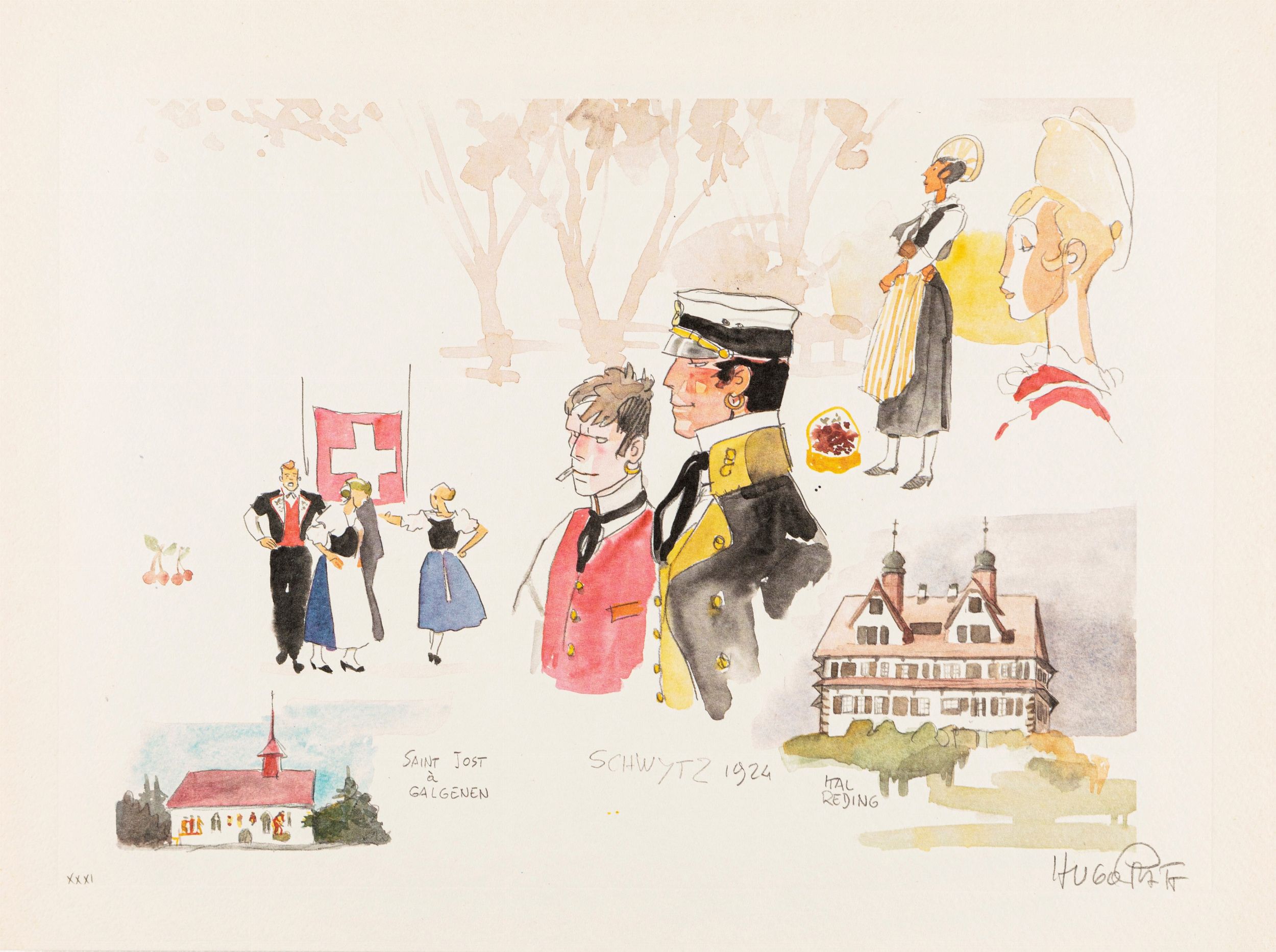 1991 Litografia a colori impressa su cartoncino di pregio Fabriano facente parte del portfolio ...et in Helvetia Corto, edito dalla Cong SA nel 1991. Portfolio realizzato in occasione dei festeggiamenti per i 700 anni della Confederazione Elvetica, tirato in 899 esemplari + 100 editi in cifra romana. Litografia proveniente della tiratura di testa in cifre romane (copia XXXI/C). Firmata a matita personalmente da Pratt e numerata.